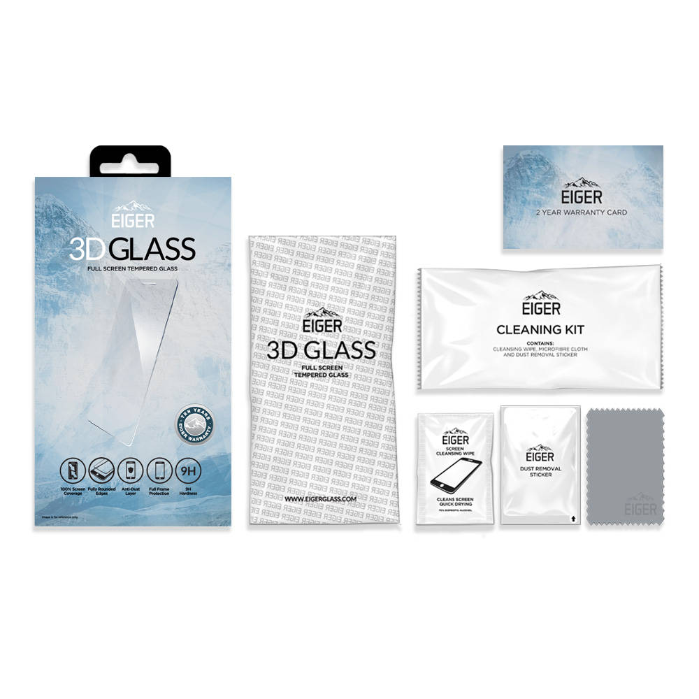 - 1 х Eiger 3D Glass Case Friendly Curved Tempered Glass - 1 x микрофибърна кърпичка - 1 х мокра кърпичка - 1 х антистатична лепенка за премахване на прашинки