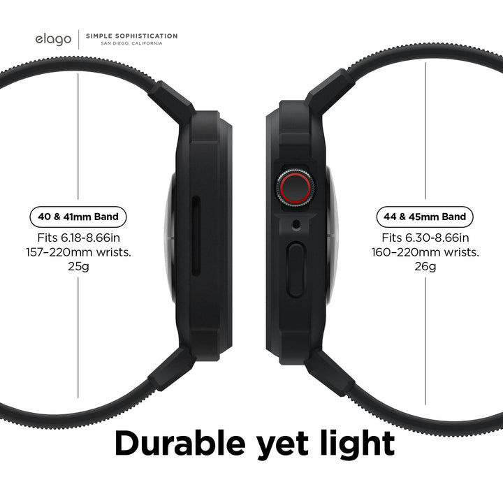 Elago Armor Case предлага комбинация от стил и здравина, осигурявайки надеждна защита за вашия Apple Watch. Изработен от TPU, този кейс е гъвкав, устойчив на атмосферни влияния и изключително здрав. Часовникът пасва плътно в кейса, а пълният достъп до всички бутони и входове прави употребата му изключително удобна. Не пропускайте възможността да защитите вашия Apple Watch с Elago Armor Case!