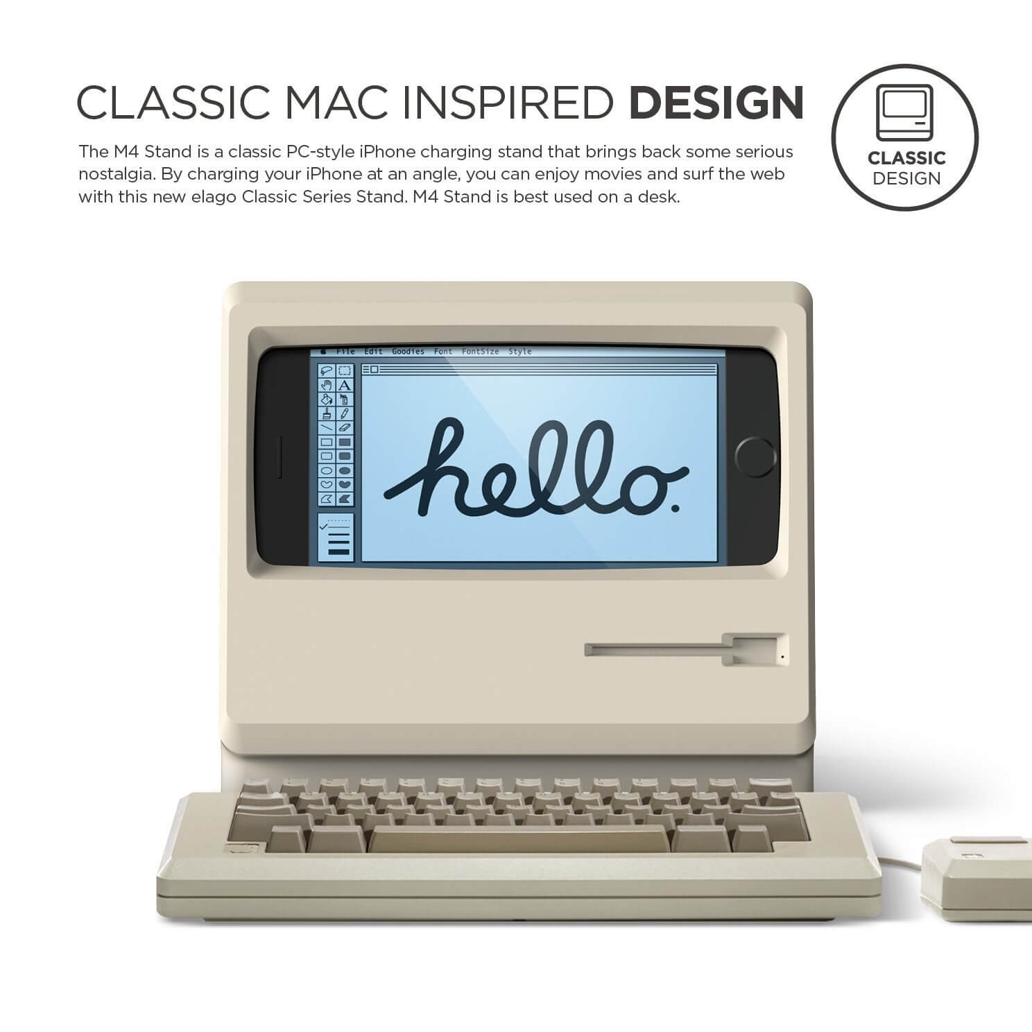 - Върнете се към миналото и изпитайте носталгия както никога до сега с поставката M4, която е с дизайна на стар Apple монитор