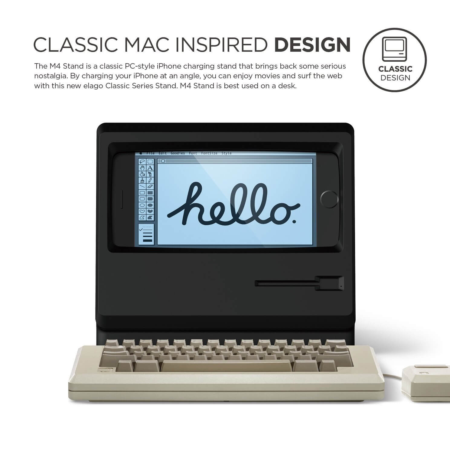 - Върнете се към миналото и изпитайте носталгия както никога до сега с поставката M4, която е с дизайна на стар Apple монитор