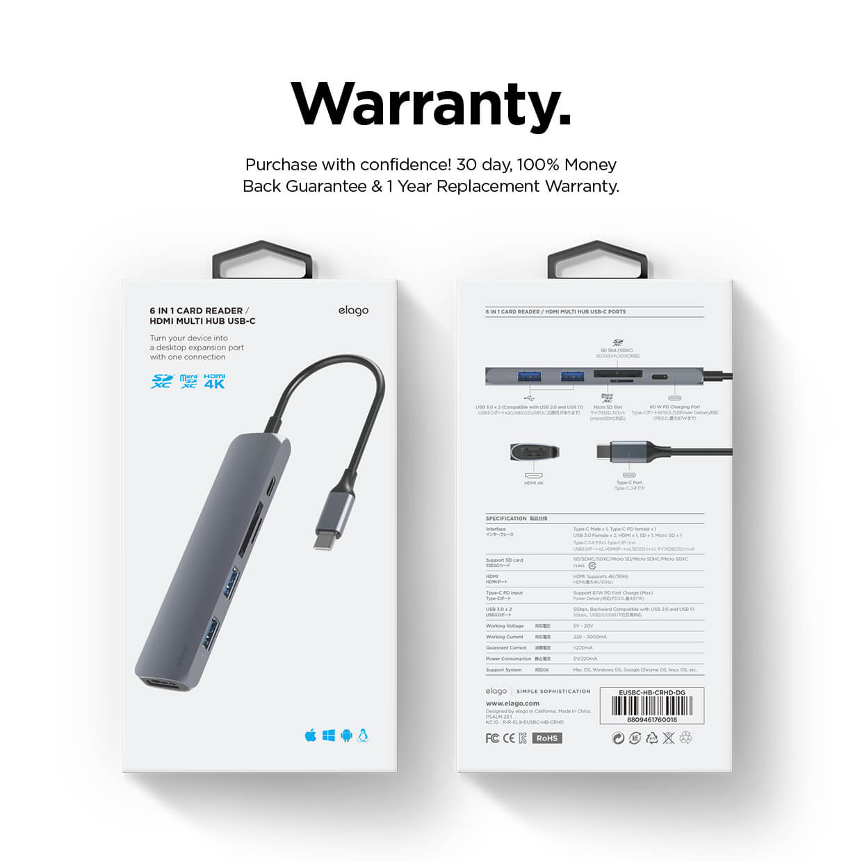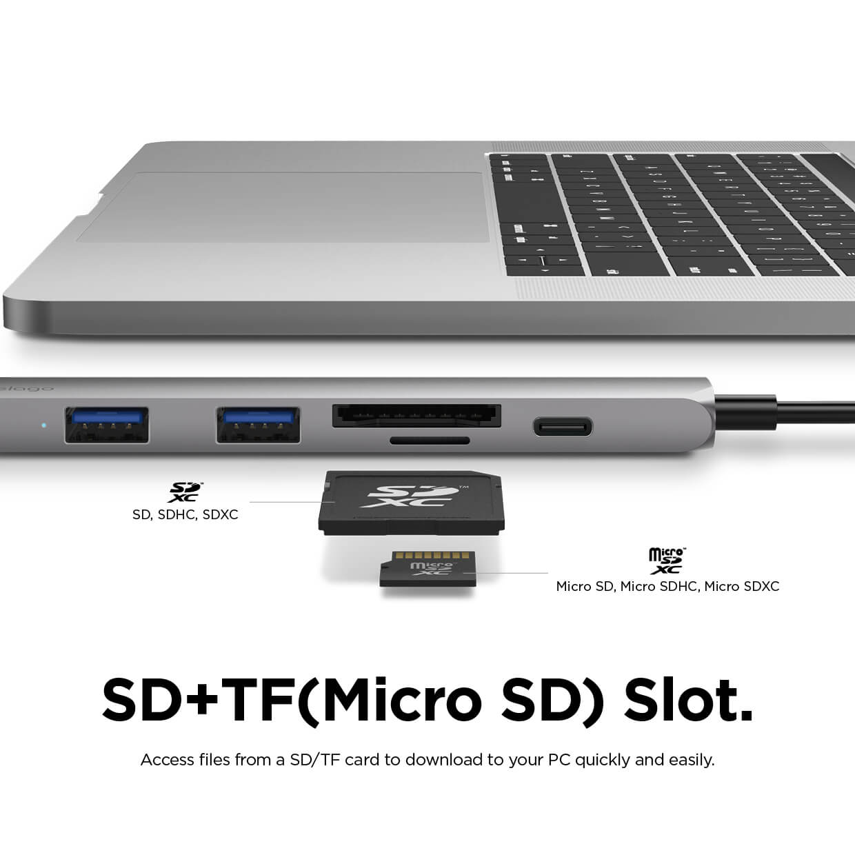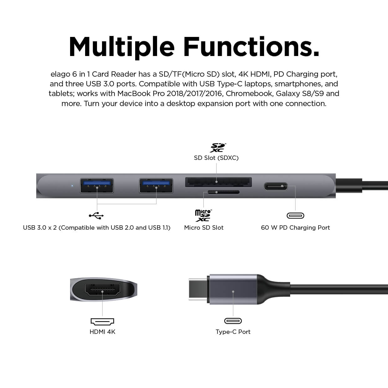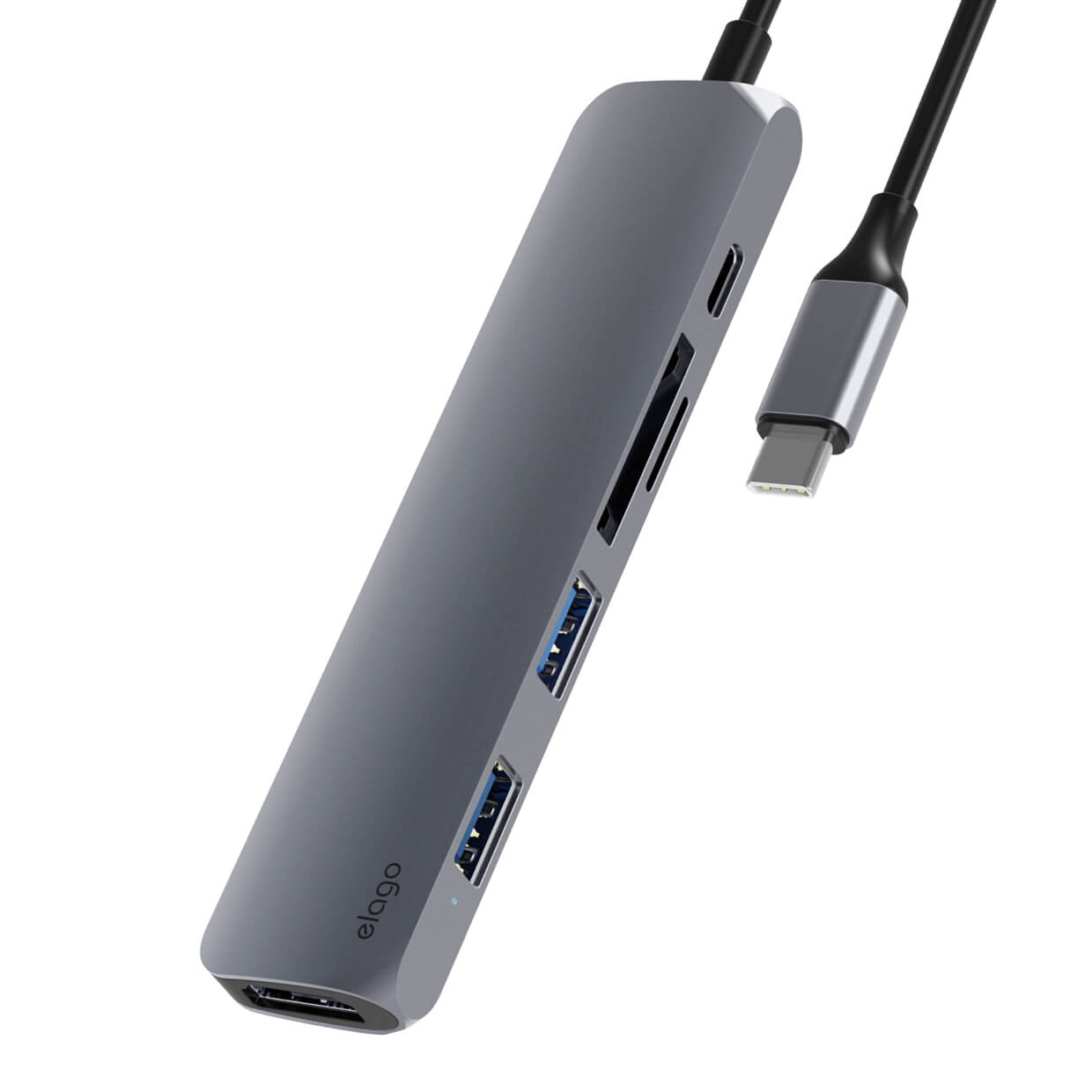 Elago Multi 6 in 1 USB-C Hub Card Reader - мултифункционален хъб за свързване на допълнителна периферия за устройства с USB-C (тъмносив)
