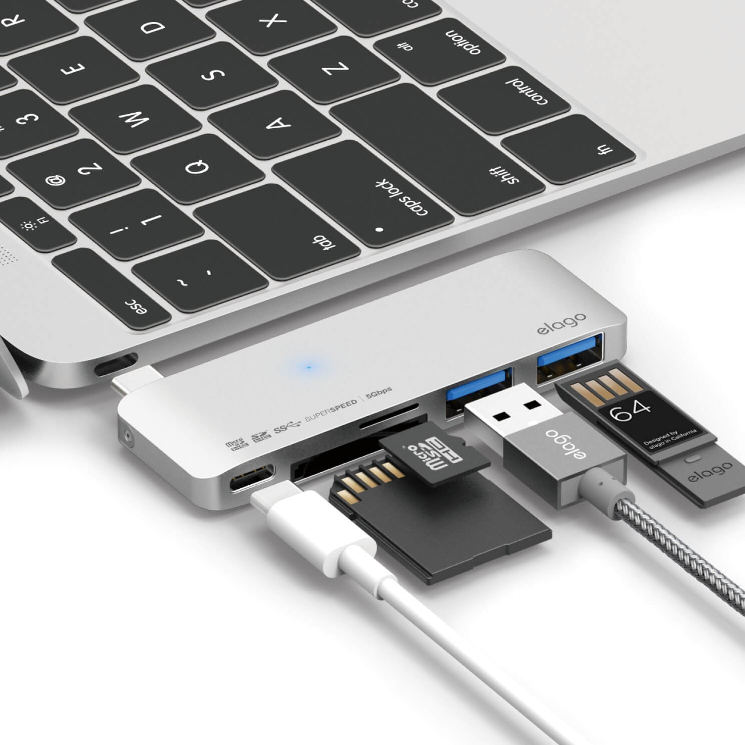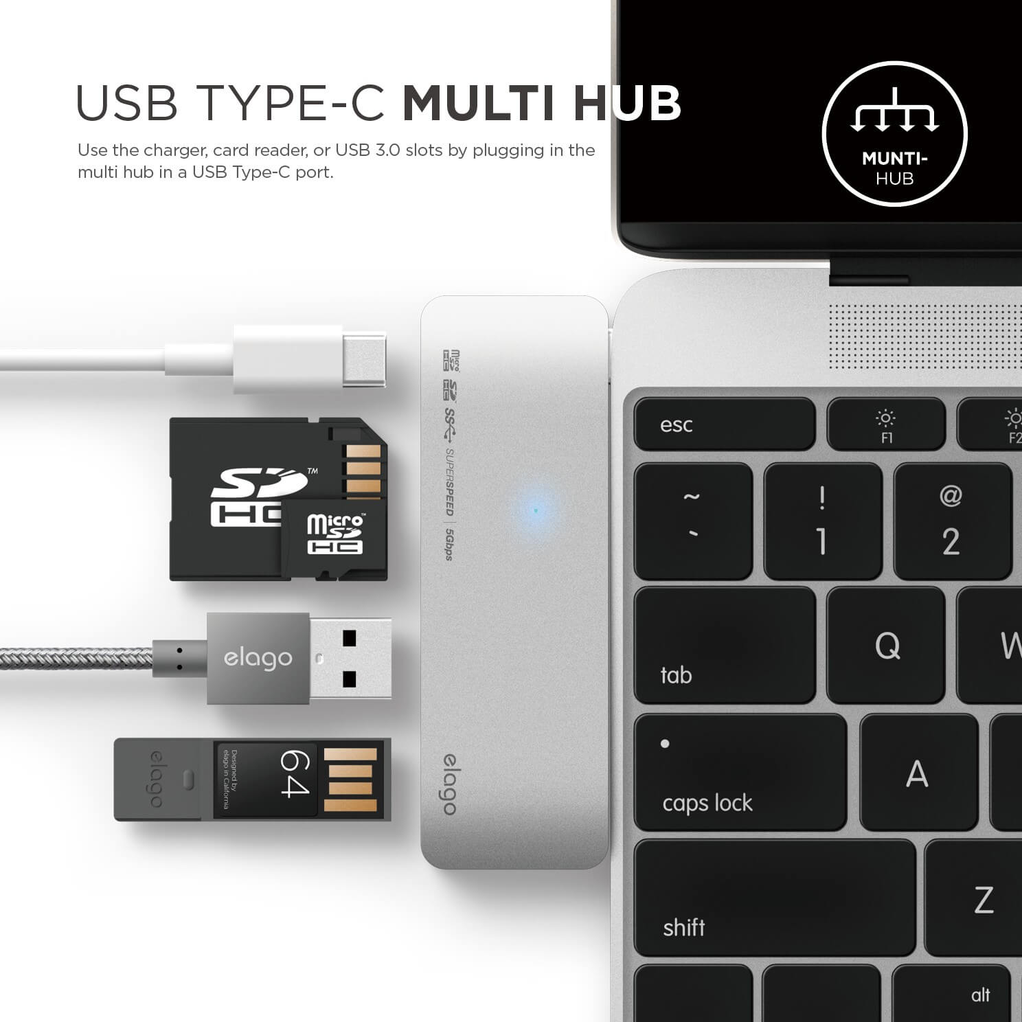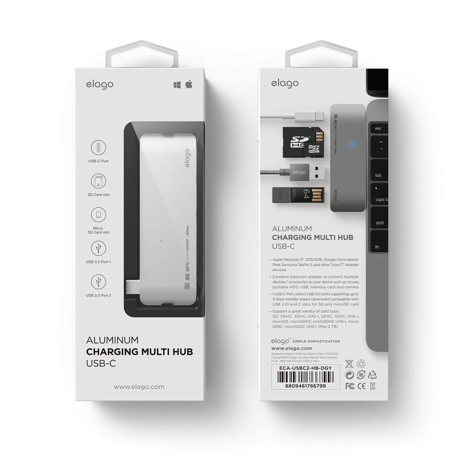 Elago Multi USB-C Hub - USB-C хъб към 2xUSB 3.0, MicroSD, SD и USB-C за MacBook и устройства с USB-C порт (сребрист)