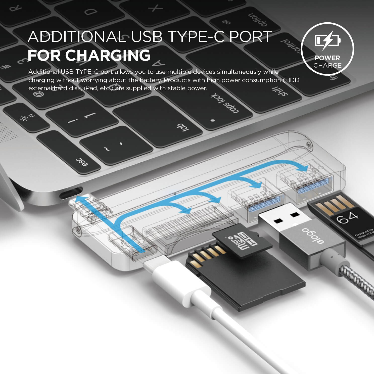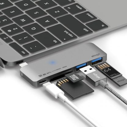 - Налични 5 изхода: USB Type-C порт за зареждане на вашия MacBook, SD четец, MicroSD четец и 2 броя USB 3.0 порта. Всички функции могат да бъдат използвани заедно