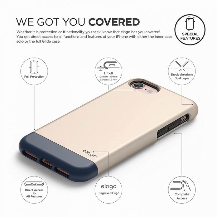 - С новата Gldie S7 серия на Elago реално получавате не един, а два кейса! Забравете за традиционния Glide Case, който е изработен изцяло от две съединяващи се поликарбонатни части. В Glide S7 първо поставяте телефона си в Elago Slim Fit Soft Case, след което съединявате двете поликарбонатни части на Glide кейса