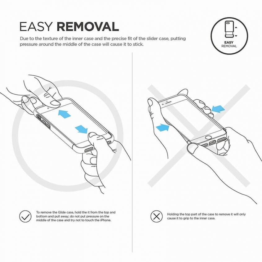 - Внимание: можете да използвате самостоятелно включения в комплекта Elago Slim Fit Soft Case, но за да използвате Glide кейса, то трябва първо да поставите телефона си в силиконовия калъф и след това в Glide кейса.