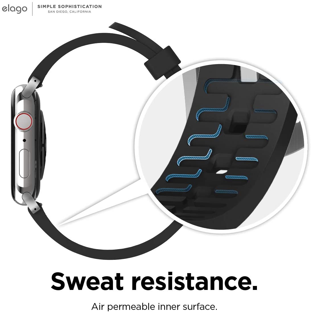 - Подобно на спортните каишки, тази на elago е дишаща, но по различен начин! Въздушната пропусклива вътрешна повърхност предоставя висока устойчивост на пот, което прави тази каишка изключително удобна за тренировки