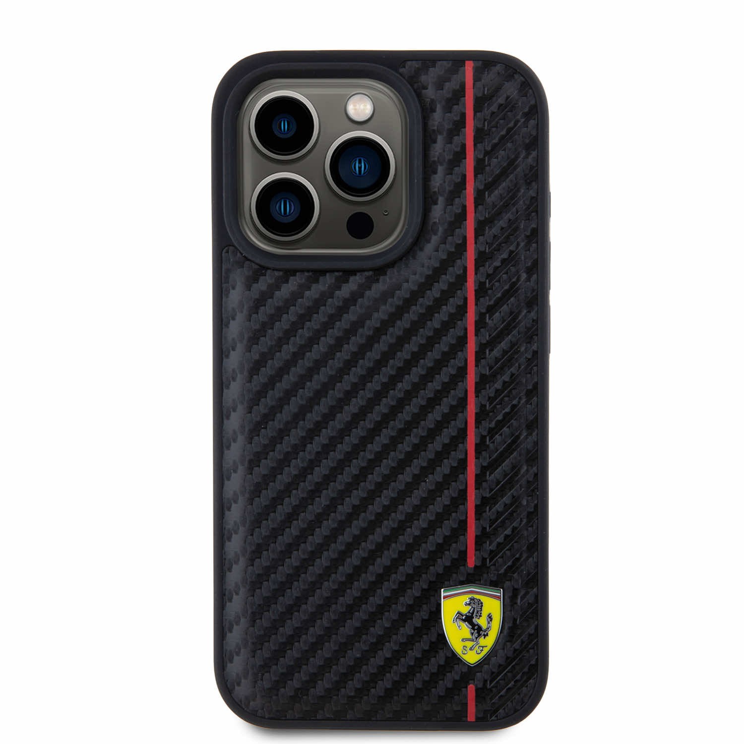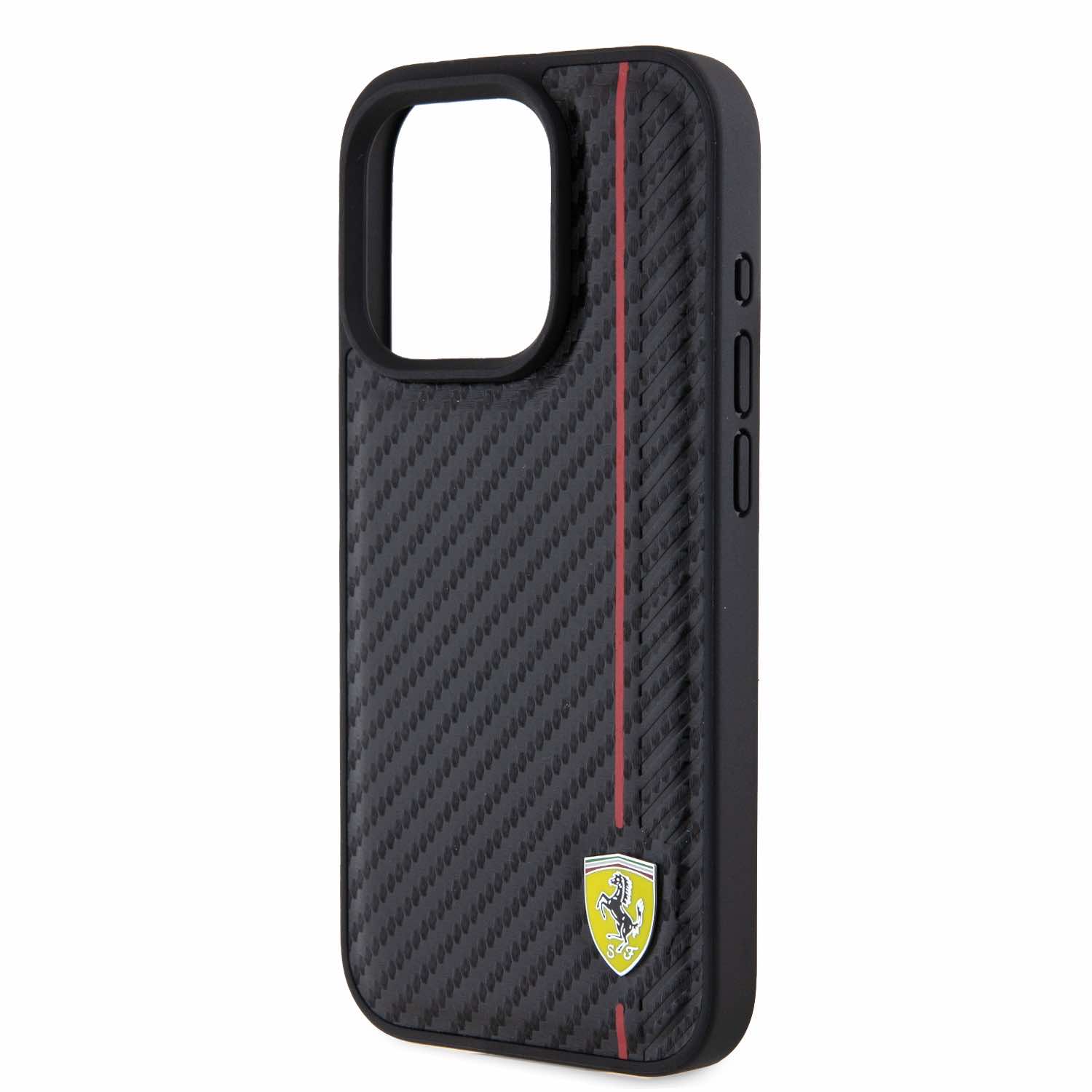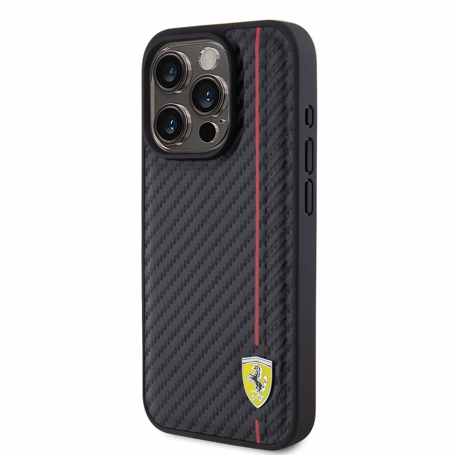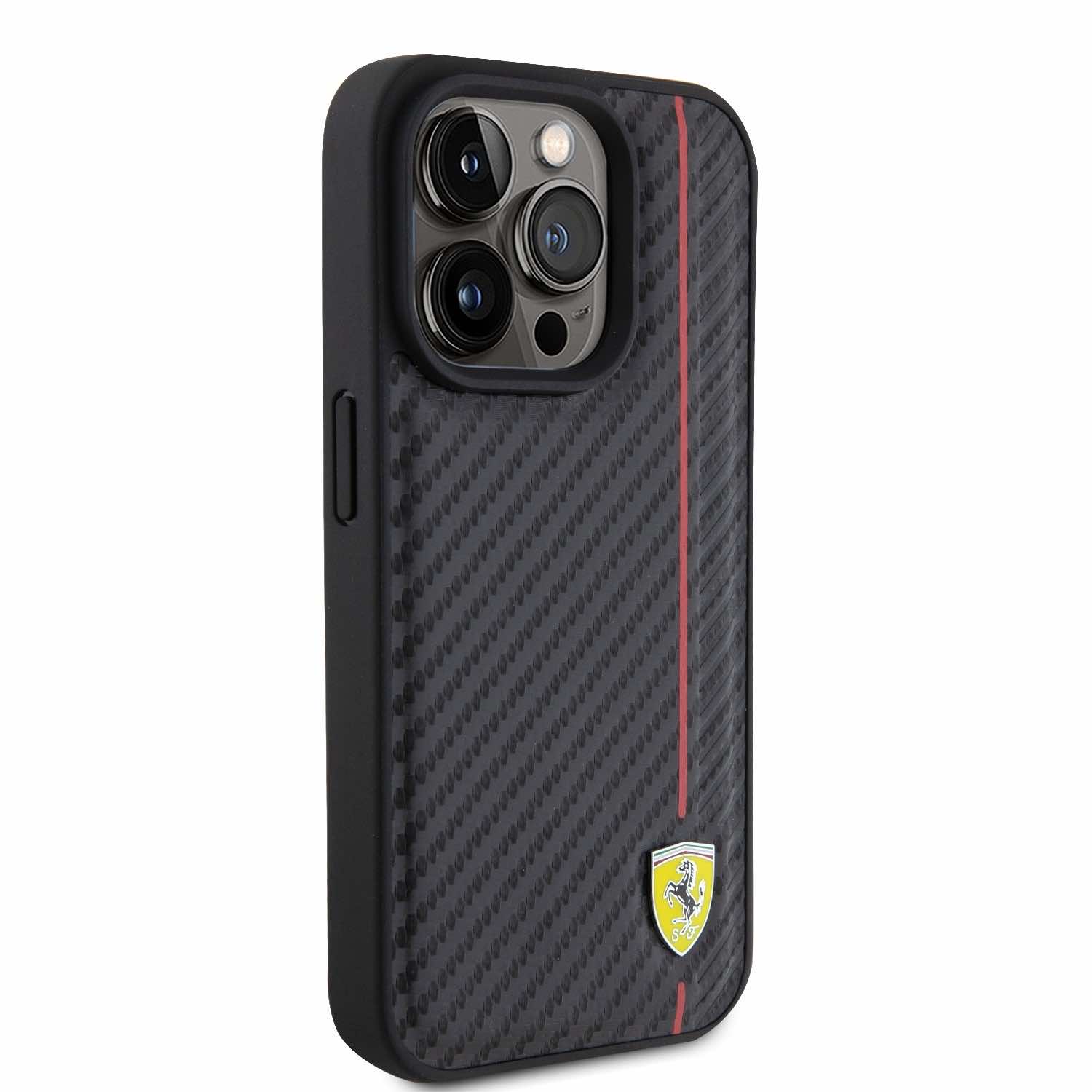 Ferrari PU Leather Carbon Vertical Red Line Case - дизайнерски кожен кейс за iPhone 15 Pro (черен)