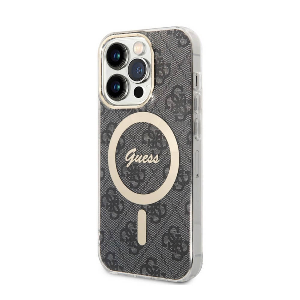 Guess 4G Printed Stripe MagSafe Case With MagSafe Wireless Charger Set - комплект хибриден удароустойчив кейс с MagSafe и поставка (пад) за безжично зареждане за iPhone 14 Pro (черен)