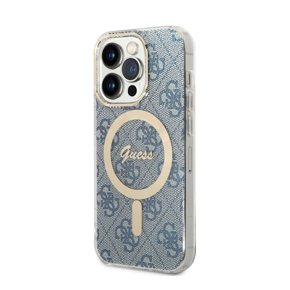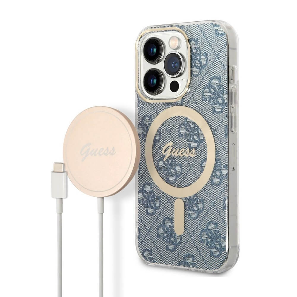 Guess 4G Printed Stripe MagSafe Case With MagSafe Wireless Charger Set - комплект хибриден удароустойчив кейс с MagSafe и поставка (пад) за безжично зареждане за iPhone 14 Pro (син)