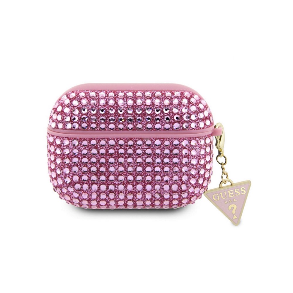 Guess Airpods Pro 2 Rhinestones Triangle Metal Logo Case - кожен кейс с висулка за Apple Airpods Pro 2 (розов)