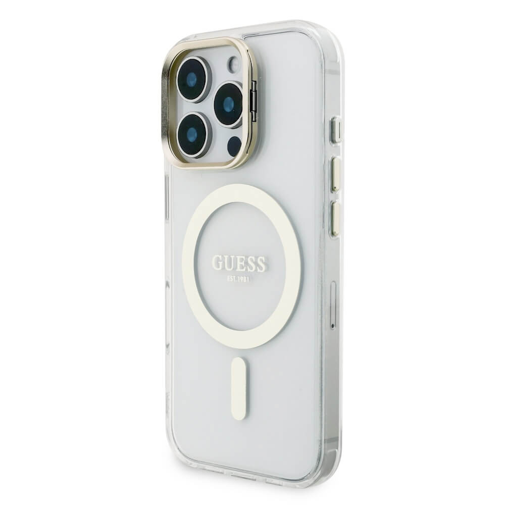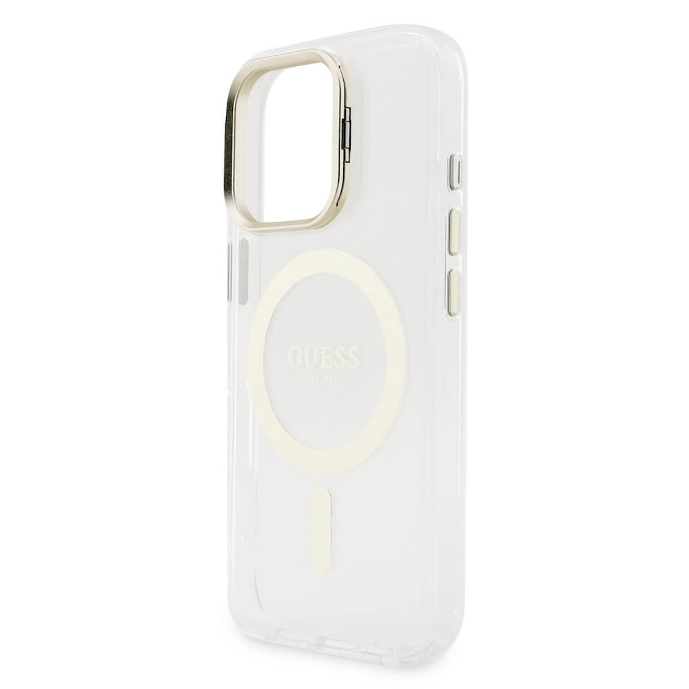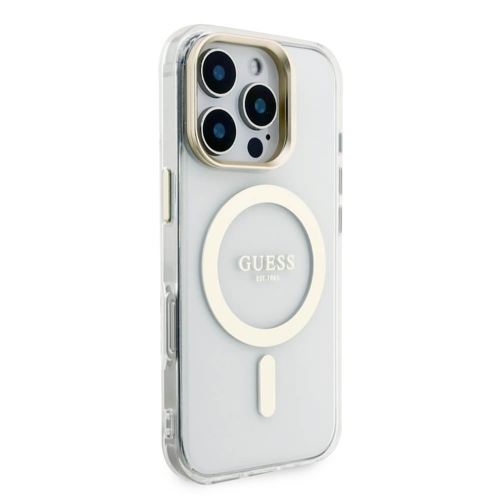 Guess Electroplated Camera Case With Interchangeable Backs - хибриден удароустойчив кейс с MagSafe и сменяеми гърбове за iPhone 16 Pro (прозрачен-златист)