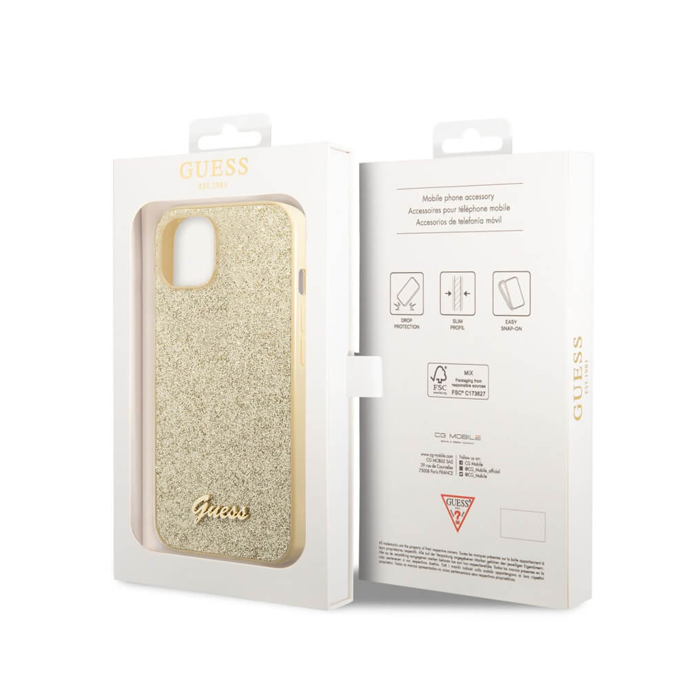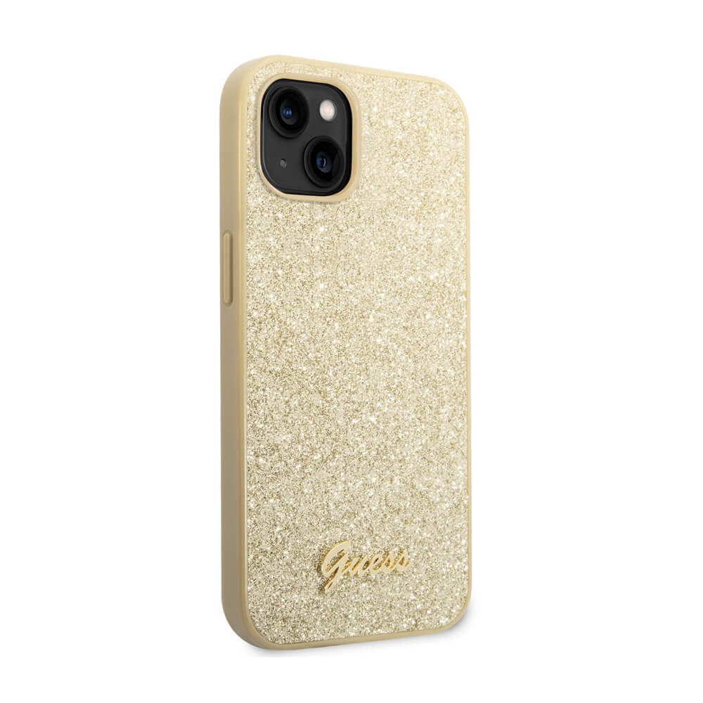 Guess Glitter Flakes Metal Logo - хибриден удароустойчив кейс за iPhone 14 Plus (златист)