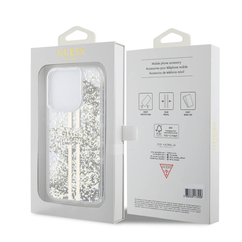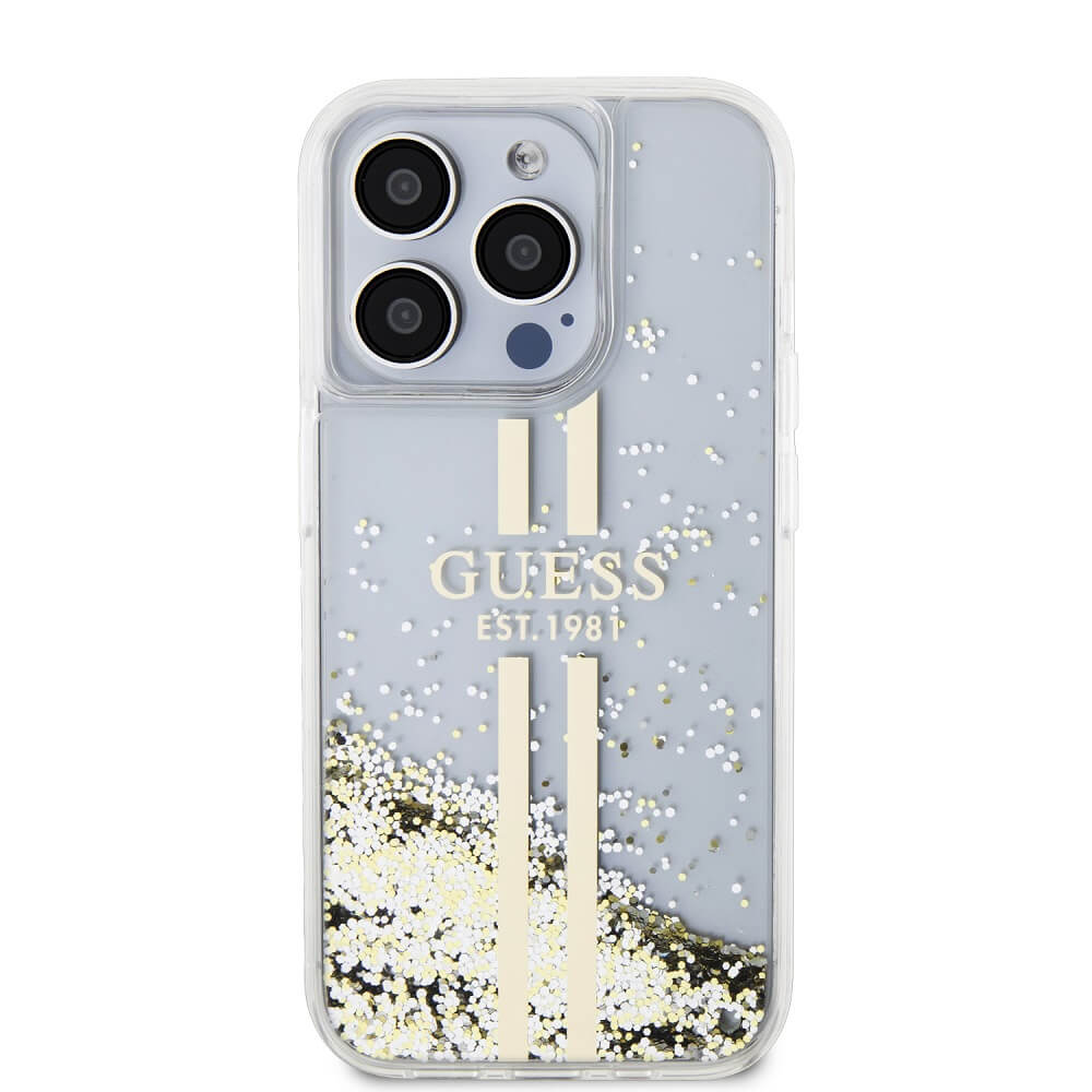 Guess Liquid Glitter Gold Stripe Case - дизайнерски кейс с висока защита за iPhone 15 Pro Max (прозрачен)