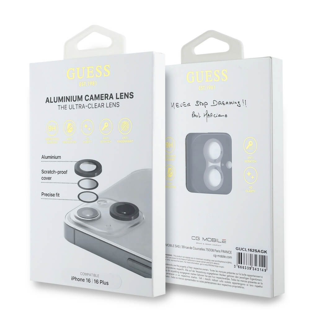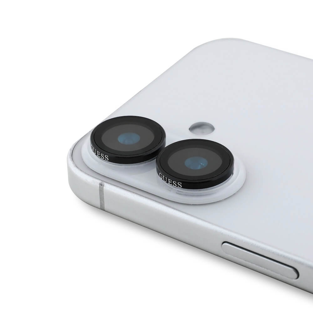 Guess Metal Tempered Glass Camera Lens Protector - предпазни стъклени лещи за камерата на iPhone 16, iPhone 16 Plus (черен)