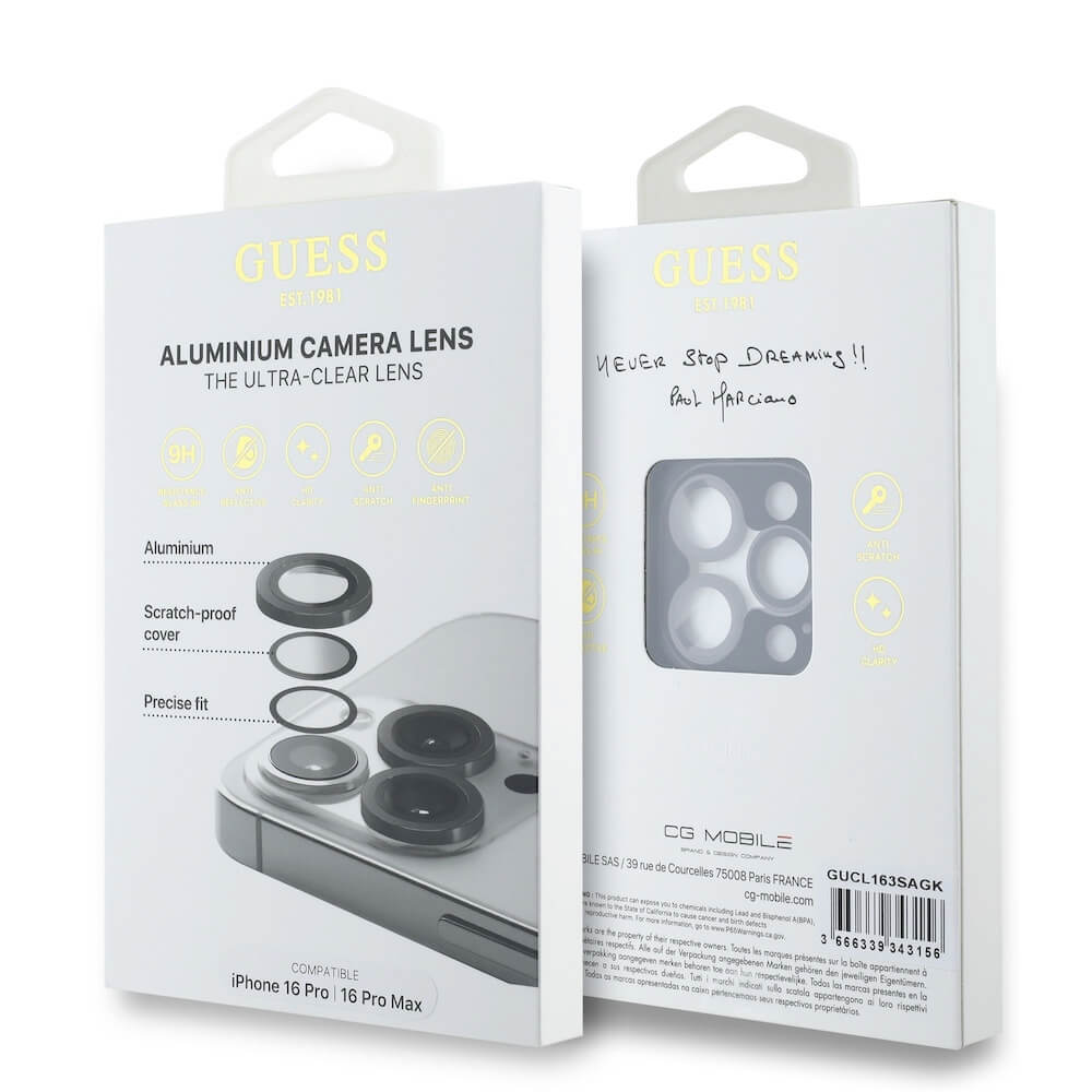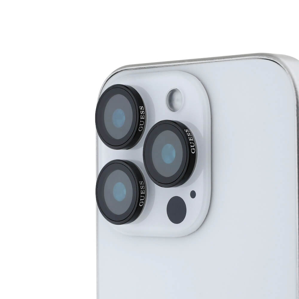Guess Metal Tempered Glass Camera Lens Protector - предпазни стъклени лещи за камерата на iPhone 16 Pro, iPhone 16 Pro Max (черен)