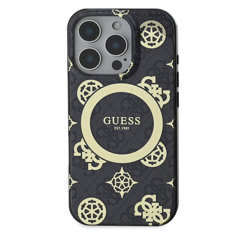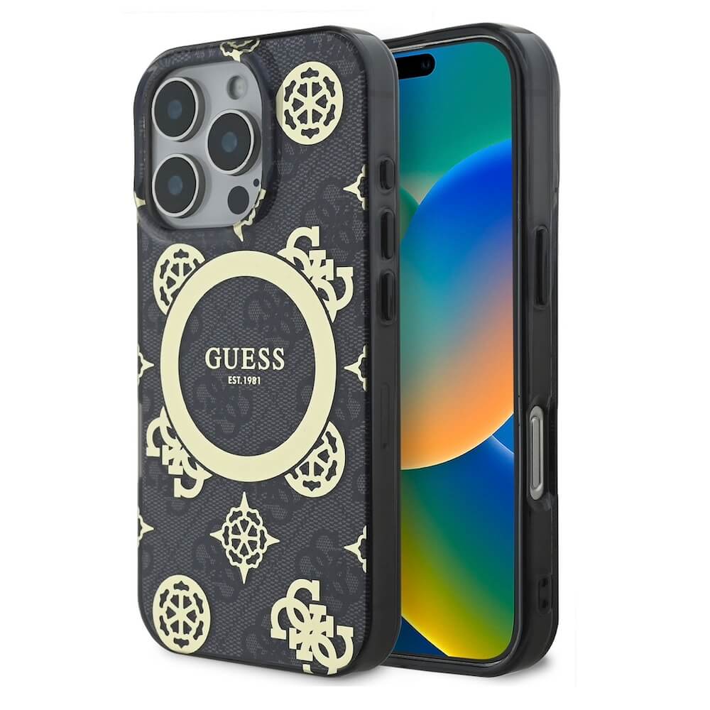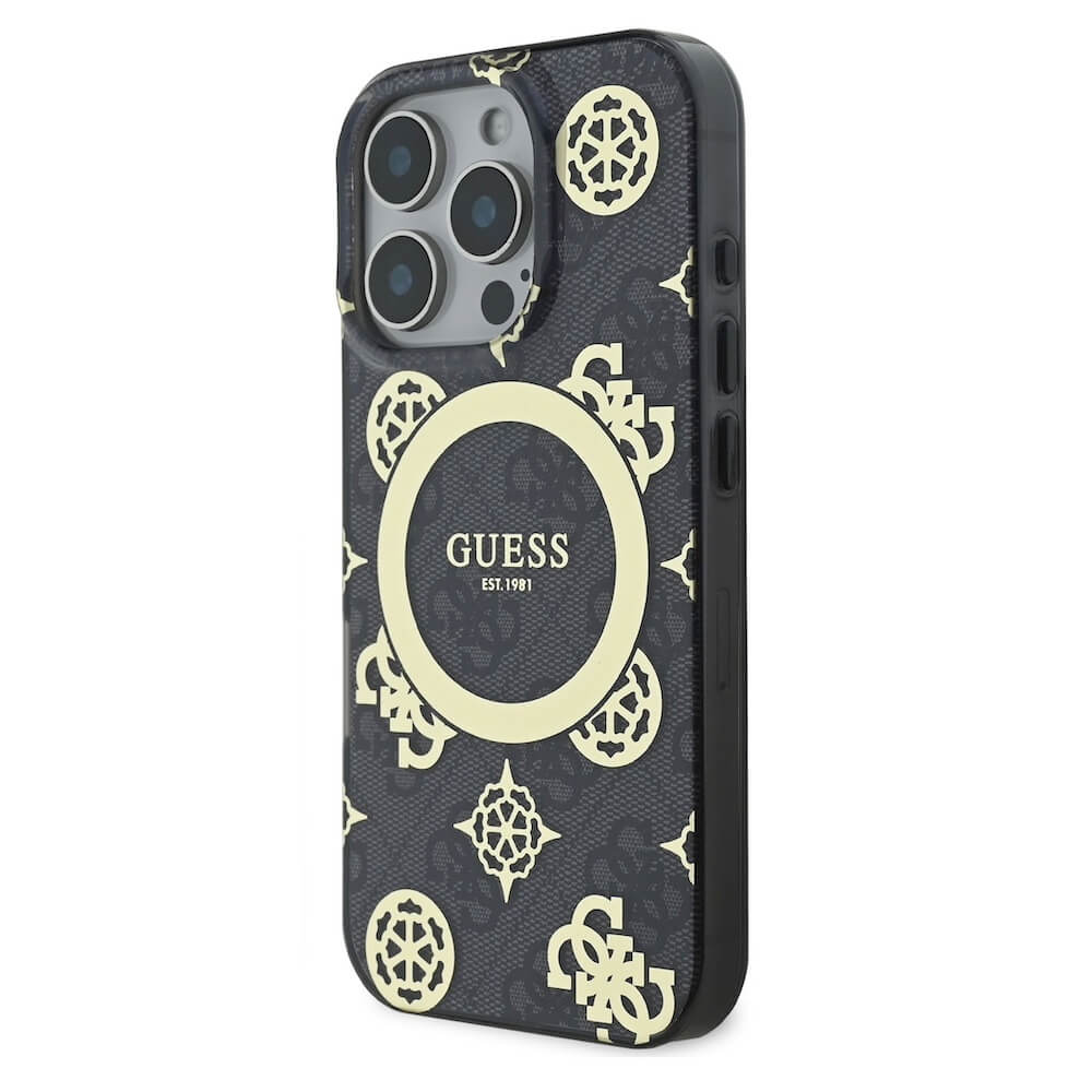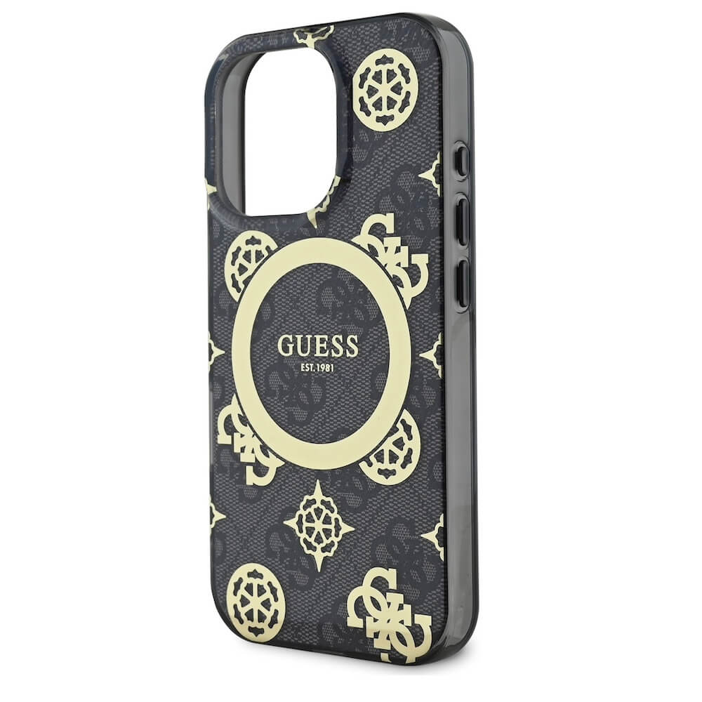 Guess PU IML 4G Peony Stamp MagSafe Leather Hard Case - дизайнерски кожен кейс с MagSafe за iPhone 16 Pro (черен)