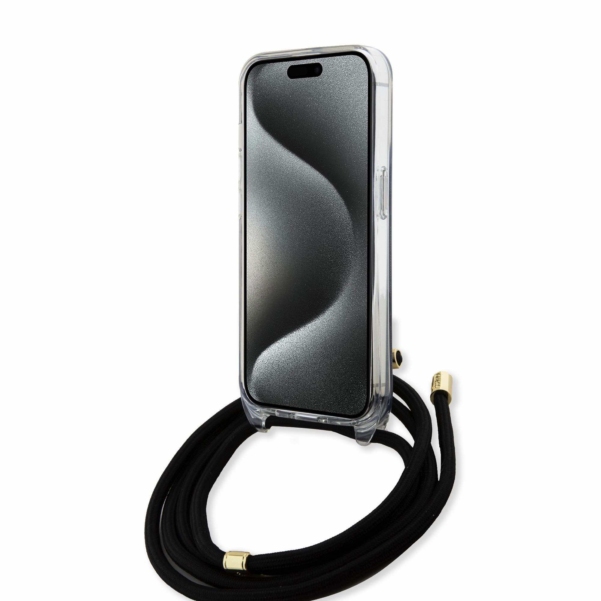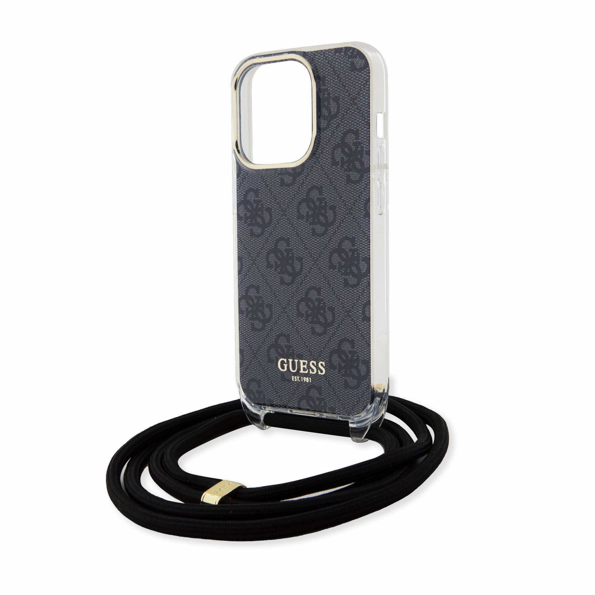 Guess PU IML 4G Printed Case With Crossbody Strap - дизайнерски кожен кейс с връзка за носене през врата за iPhone 15 Pro (черен)