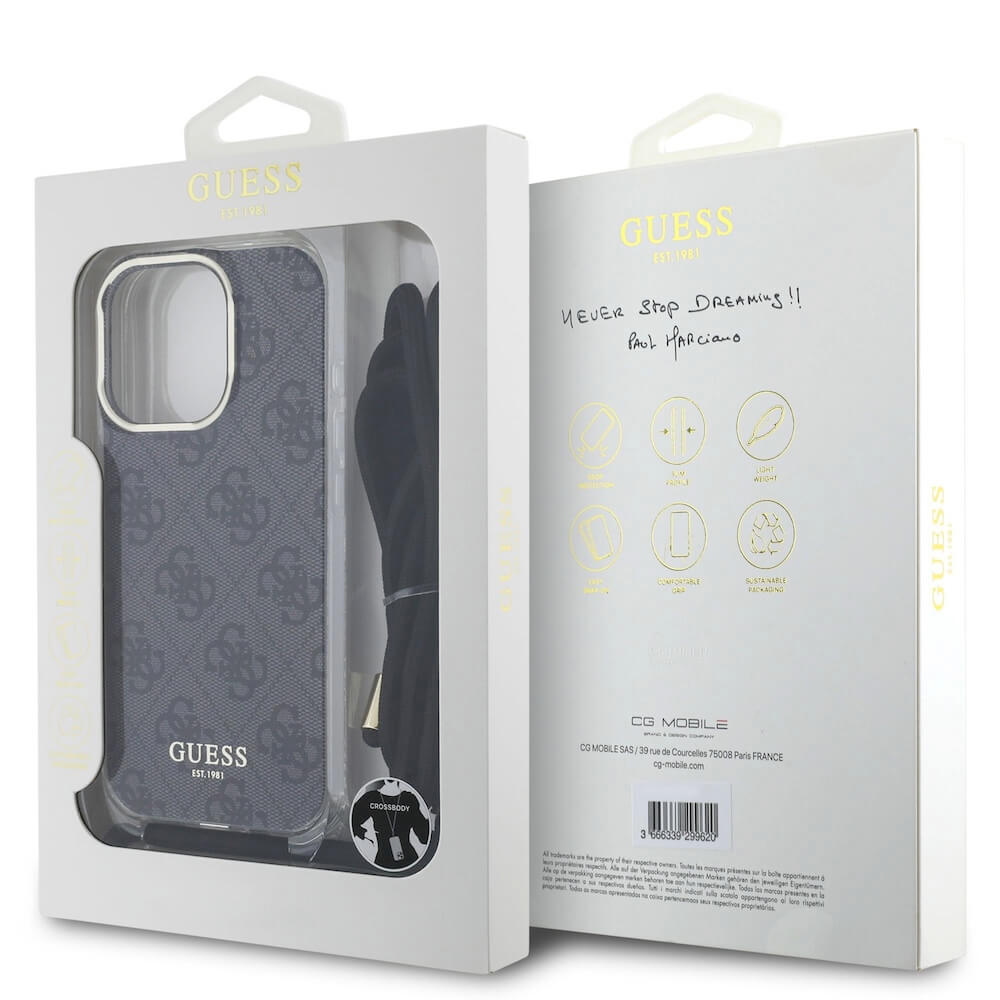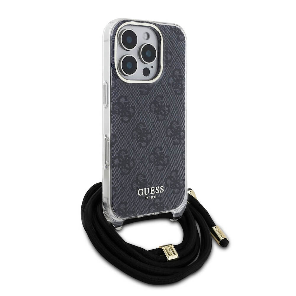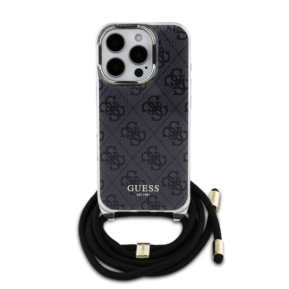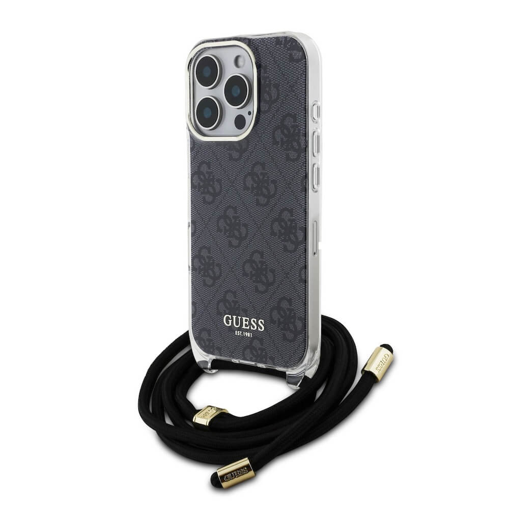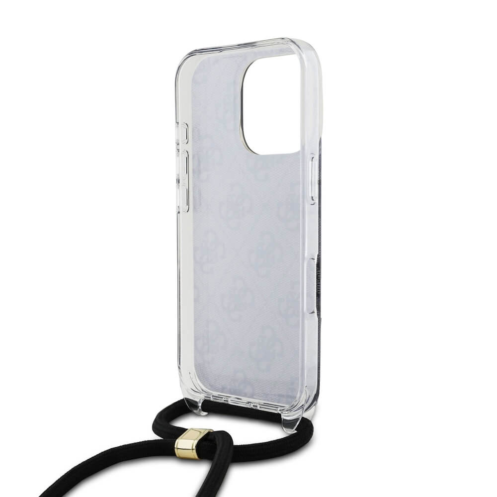 Guess PU IML 4G Printed Case With Crossbody Strap - дизайнерски кожен кейс с връзка за носене през врата за iPhone 16 Pro (черен)