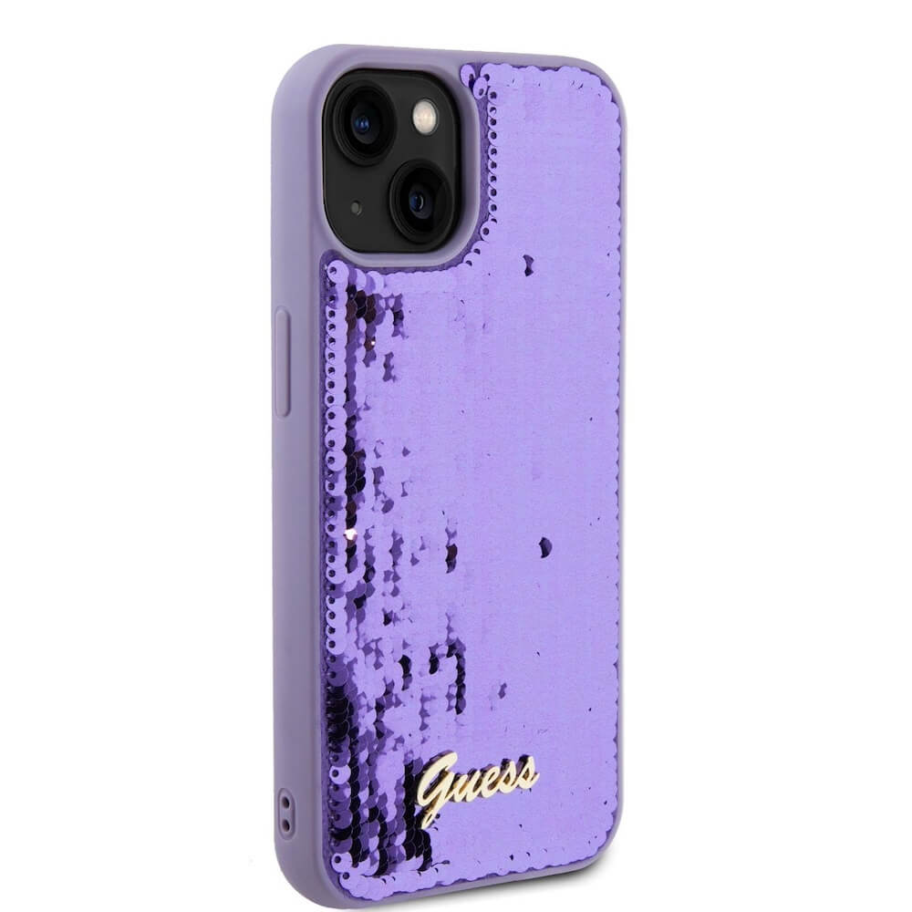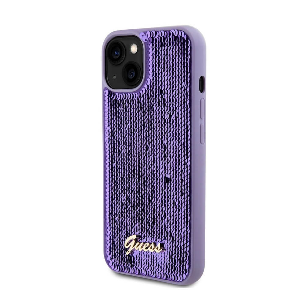 Guess Sequin Script Logo Case - дизайнерски силиконов кейс за iPhone 13 (лилав)
