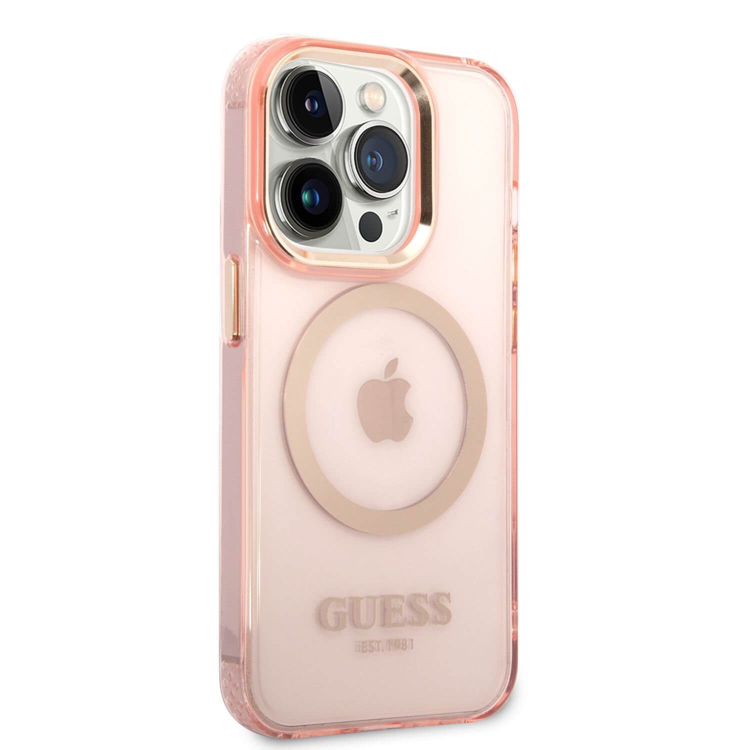 Guess Translucent MagSafe Case - хибриден удароустойчив кейс с MagSafe за iPhone 14 Pro (розов-прозрачен)