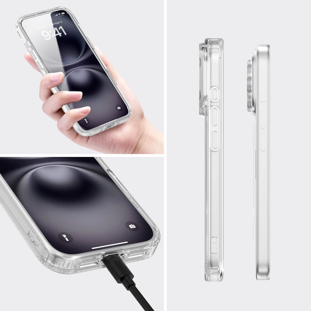 Хибридният кейс е изработен от устойчив поликарбонат и термополиуретан, което осигурява отлично съотношение цена-качество. Той е съвместим с MagSafe аксесоари, предоставяйки удобство при зареждане и свързване.
