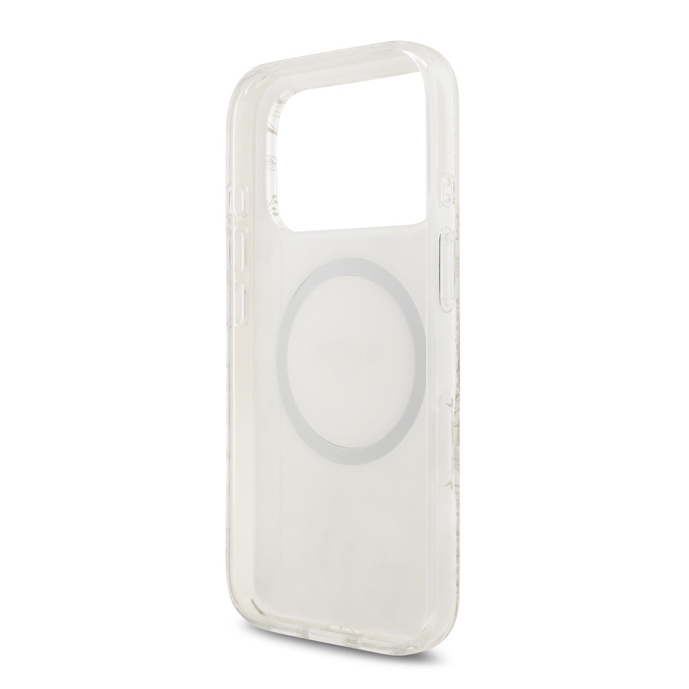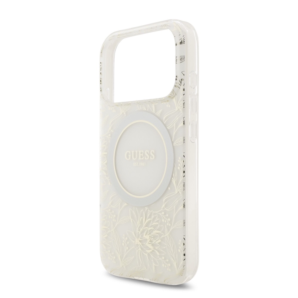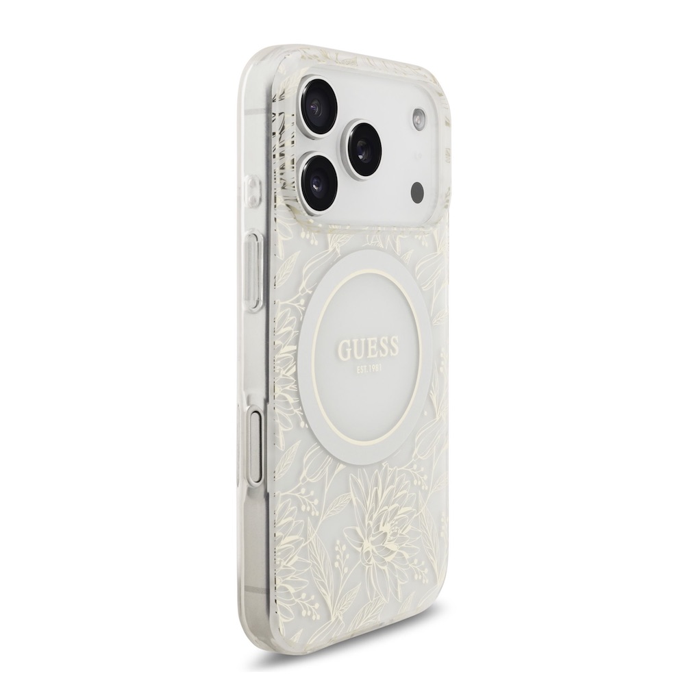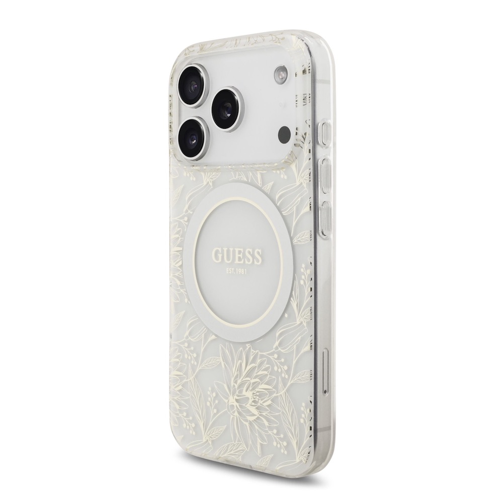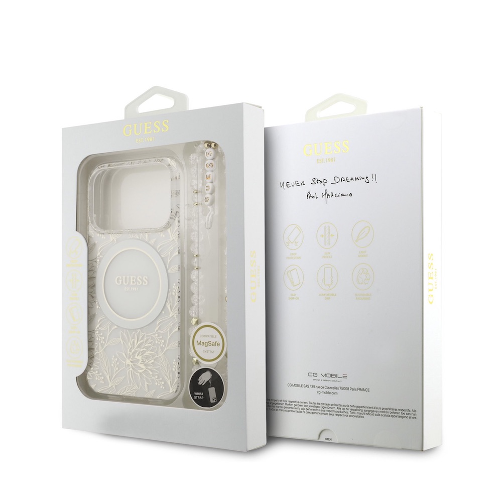 Хибриден удароустойчив кейс с MagSafe и връзка за ръка за iPhone 17 Pro - Guess IML Flowers Allover Strap MagSafe Case (бял)