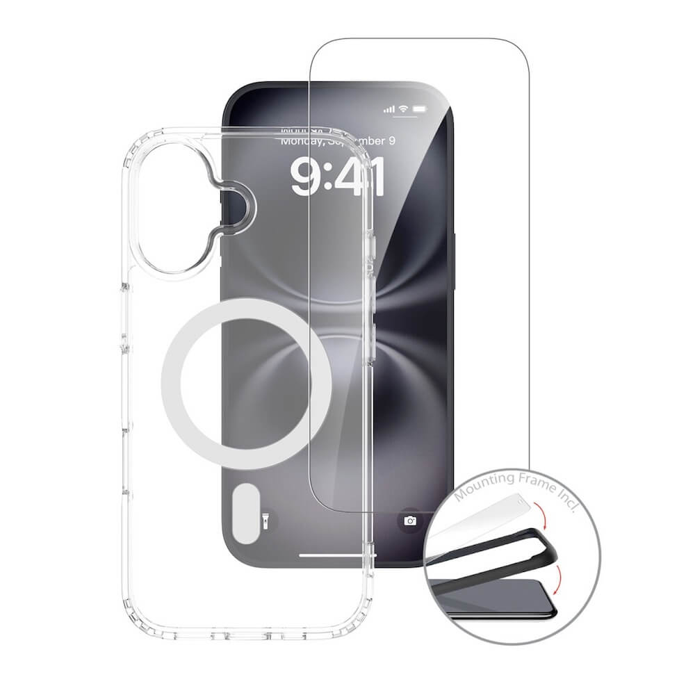 Хибриден удароустойчив кейс с MagSafe, стъклено покритие за дисплея и 20W захранване за iPhone 17 - 4smarts 3-in-1 Premium MagSafe Starter Set (прозрачен)
