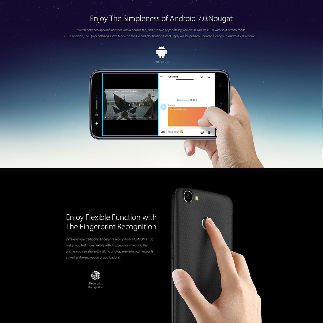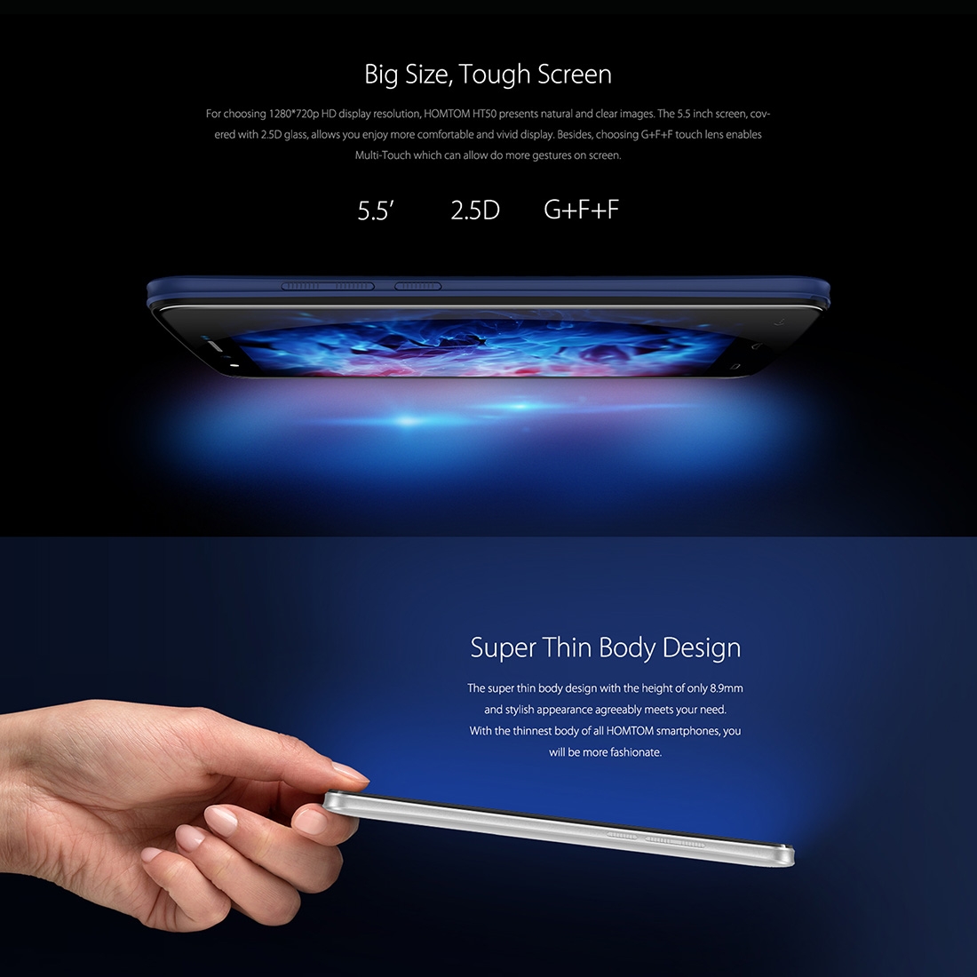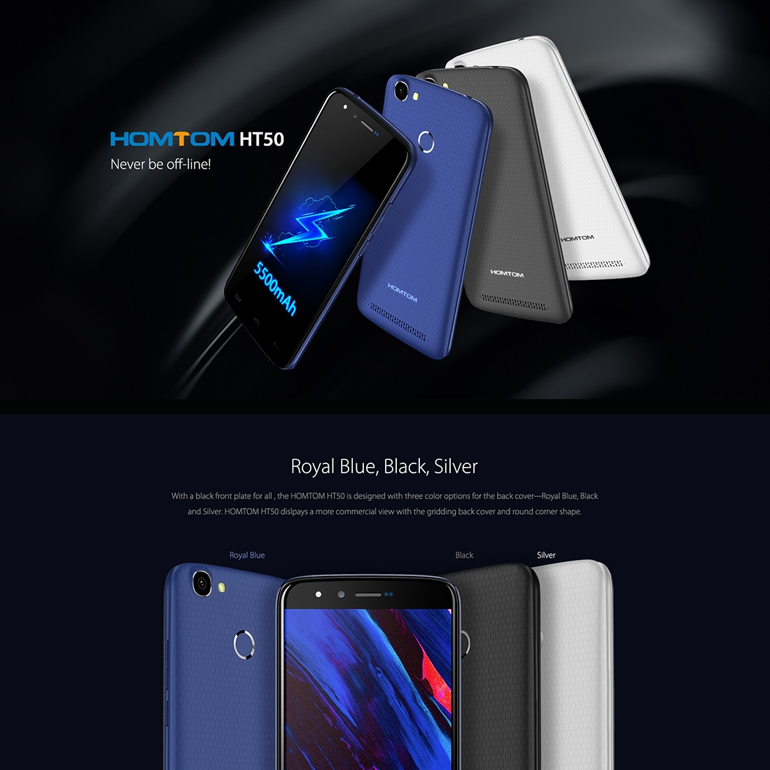 Продукта HOMTOM HT50, 5.5 инча HD, 3GB RAM, 5500 mAh батерия, 4-ядрен смартфон с 2 сим карти, Android 7 (черен) е добавен в сайта на 27 Юни 2015