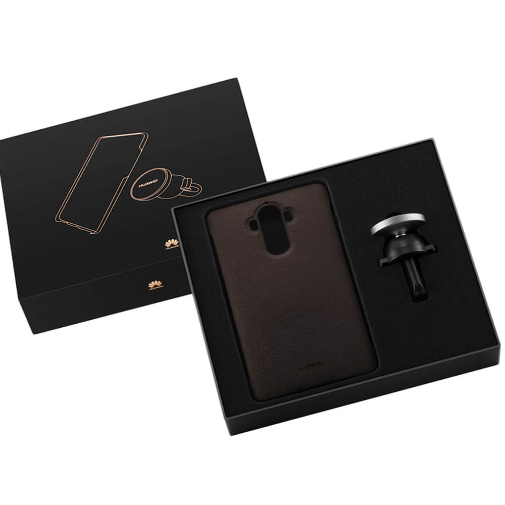 Huawei Car Holder Gift Box - подаръчен оригинален комплект от кожен кейс и магнитна поставка за Huawei Mate 9 (кафяв)