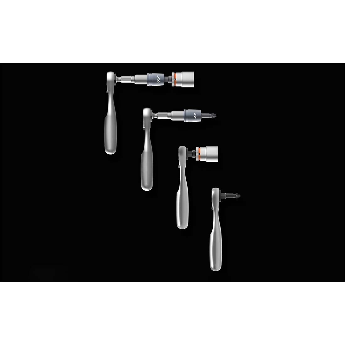 - Комплектът разполага с 28 функционални бита, 9 втулки, адаптер, тресчотка, удължител и дръжка, която пасва на всички части. Благодарение на това инструментът е идеален за смяна на велосипедни колела, демонтиране на различни части, сервизни ремонти и др. Управлявайте свободно конфигурацията на отвертката, а магнитното гнездо ще гарантира, че накрайникът е здраво закрепен, осигурявайки стабилност на цялата конструкция