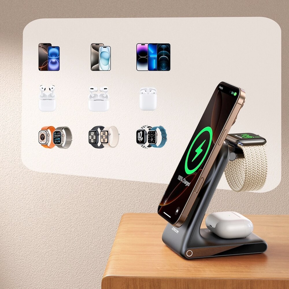 Открийте удобството и ефективността на Joyroom 3-in-1 Inductive Wireless Charging Station (модел JR-W15). Тази иновативна станция комбинира безжично зареждане с магнитно свързване, създавайки идеалното решение за вашите устройства.