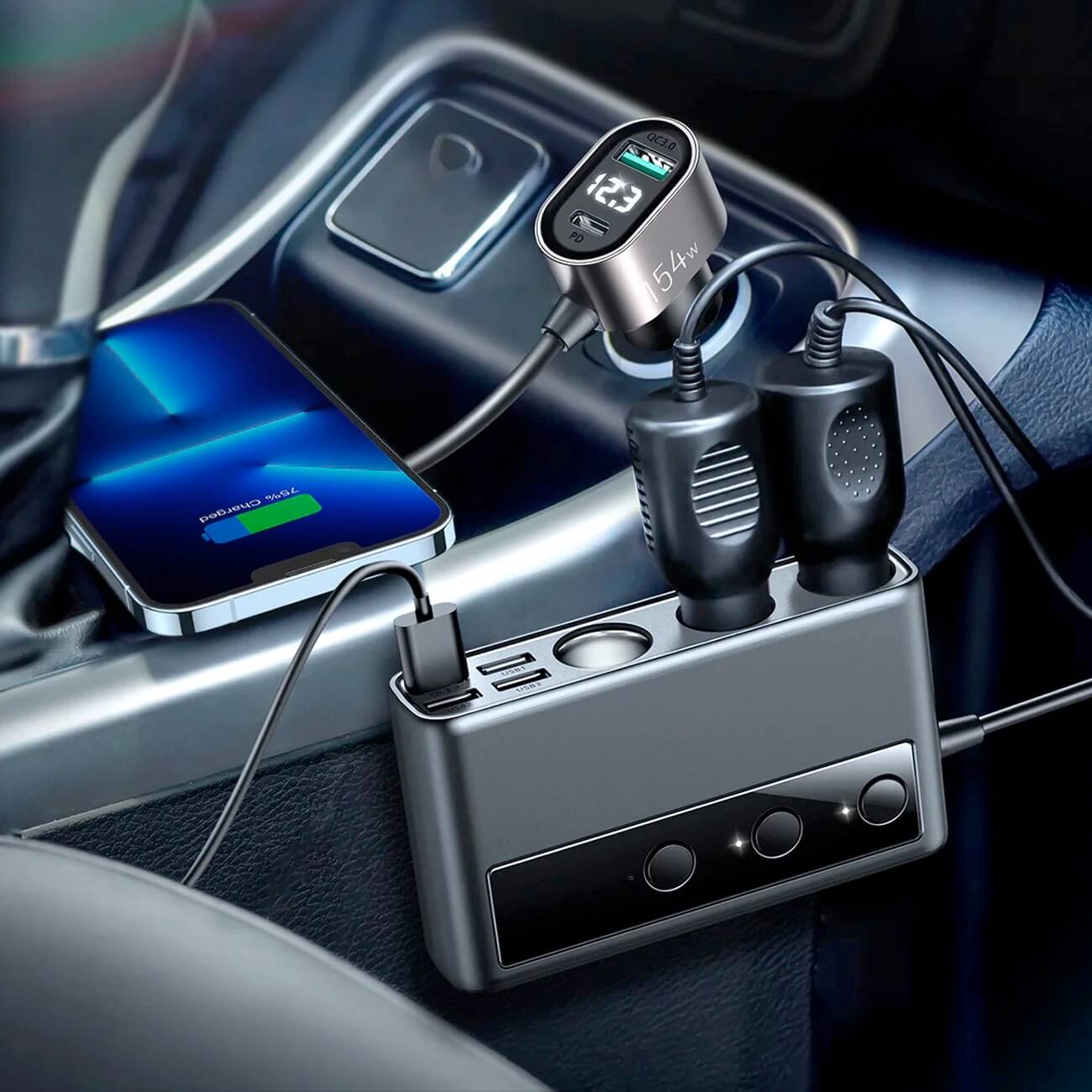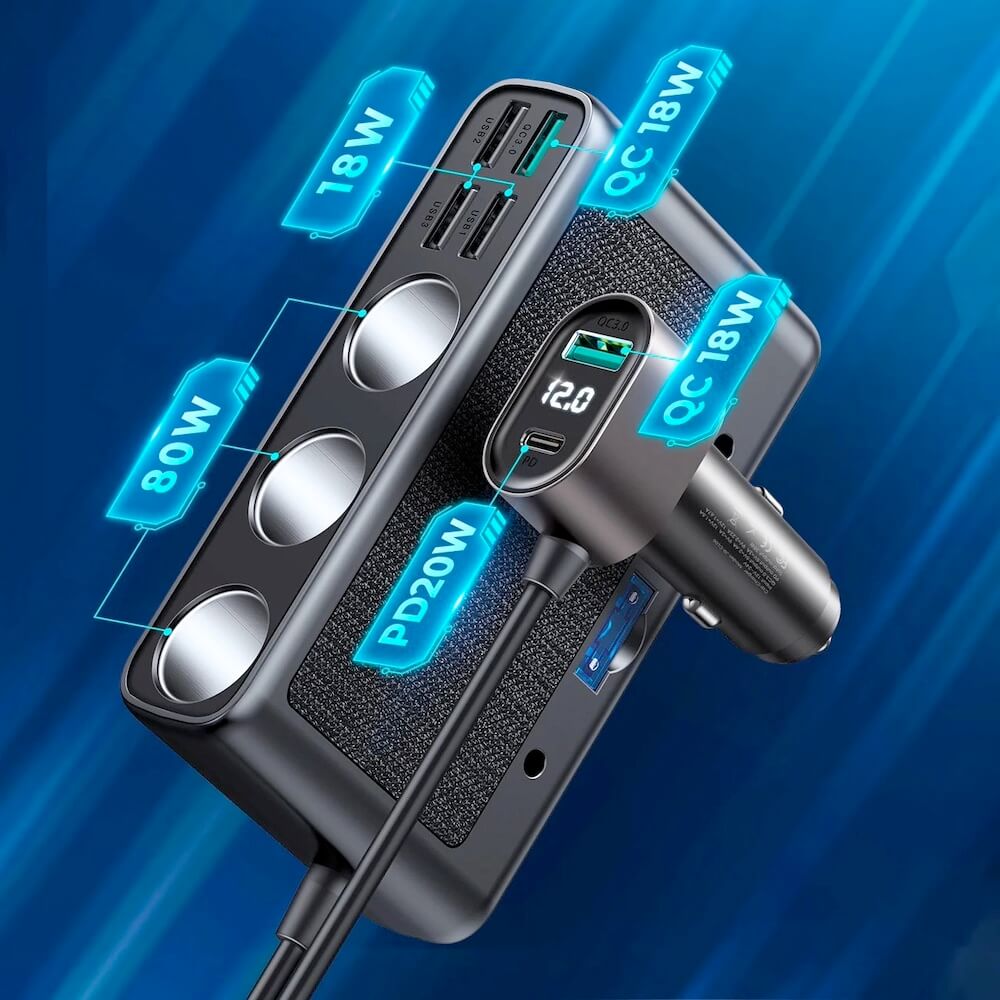- 3 x 12V гнезда за запалка и 6 порта за зареждане: 5 x USB-A и 1 x USB-C