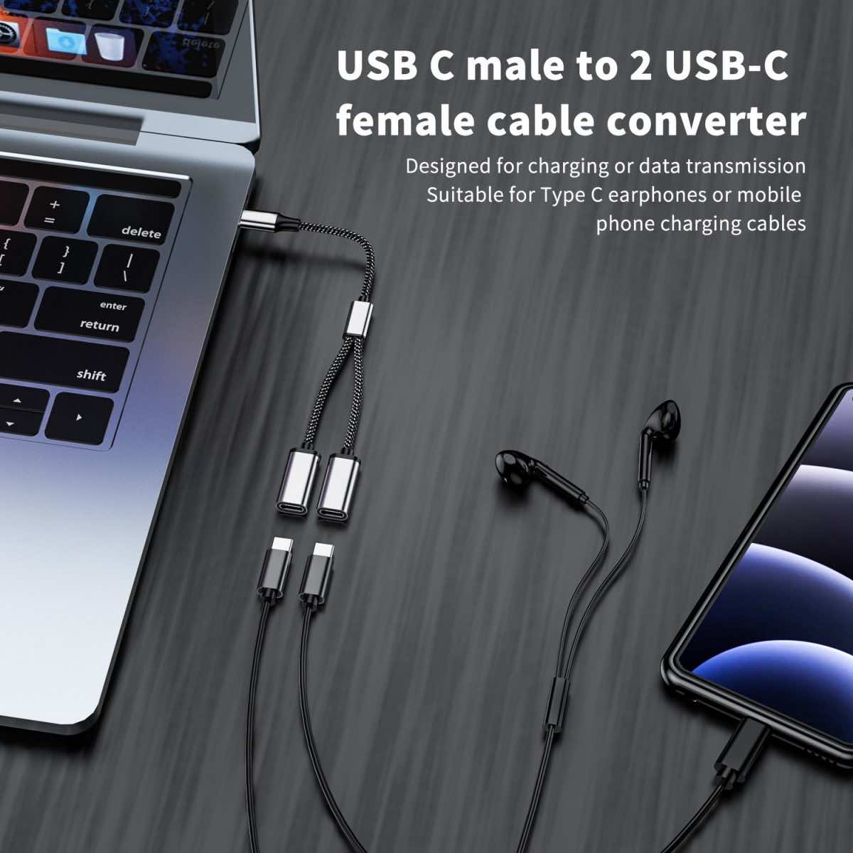 - Свързаност: USB-C мъжко към 2xUSB-C женско