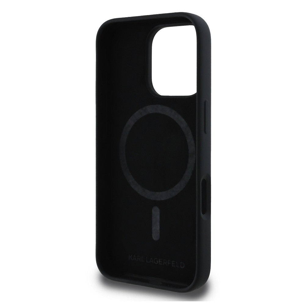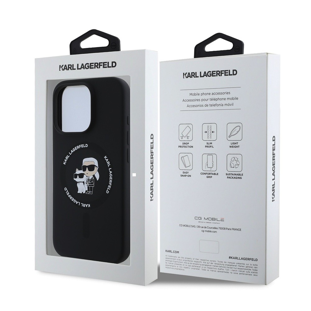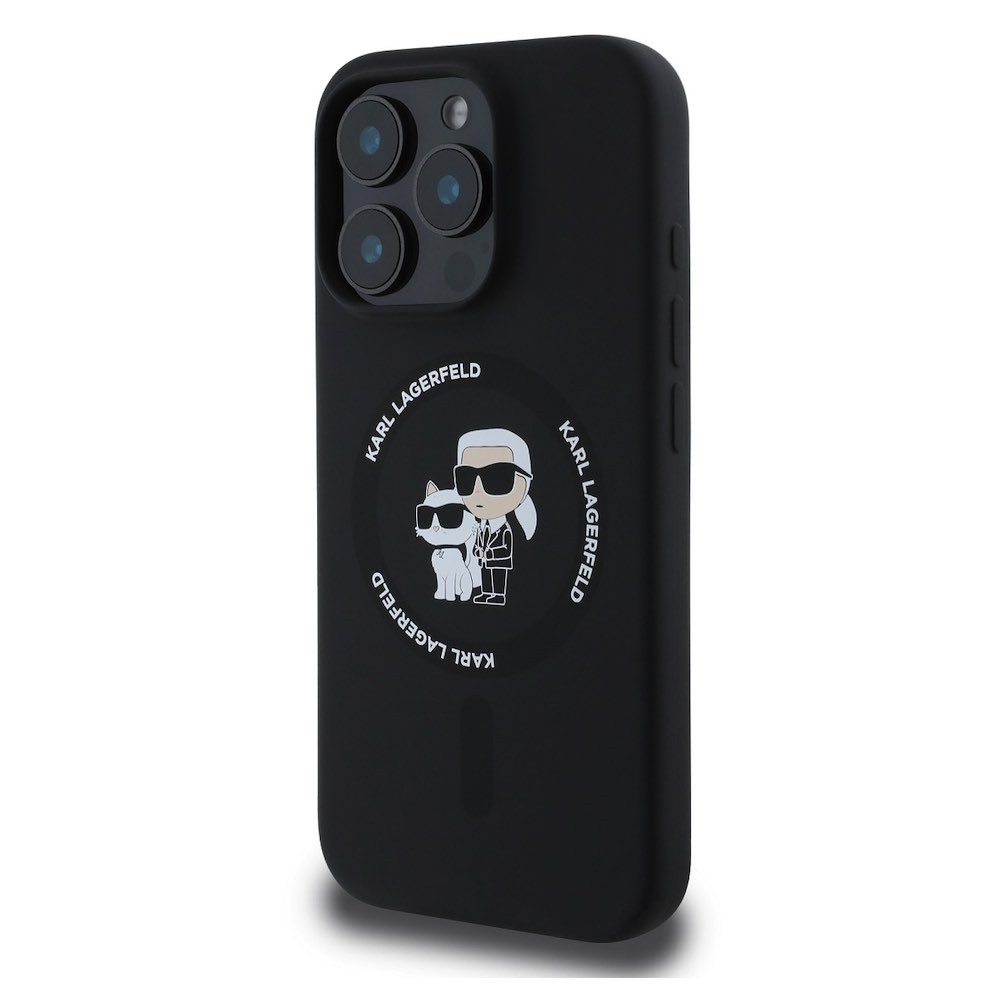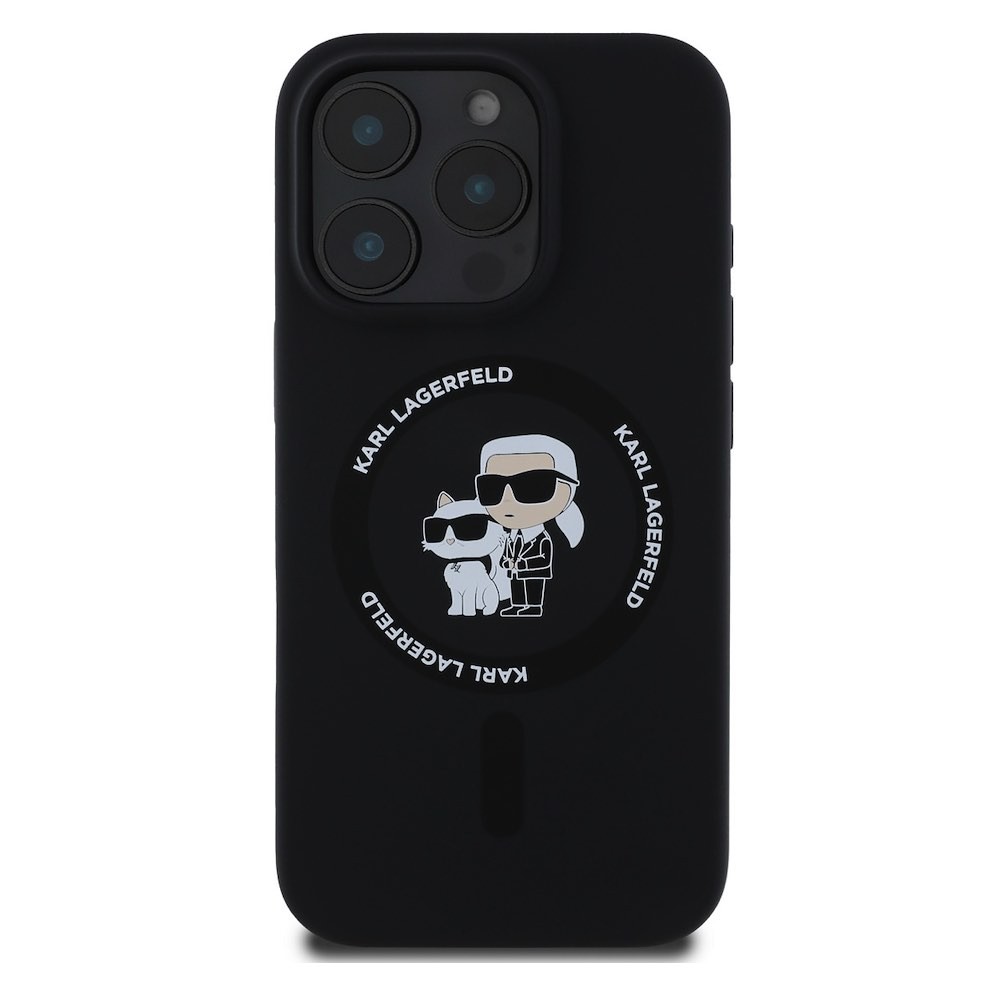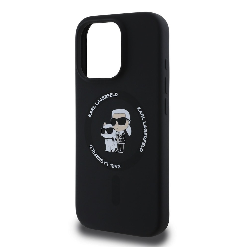 Karl Lagerfeld Liquid Silicone Karl and Choupette MagSafe Case - дизайнерски силиконов кейс с MagSafe за iPhone 16 Pro Max (черен)