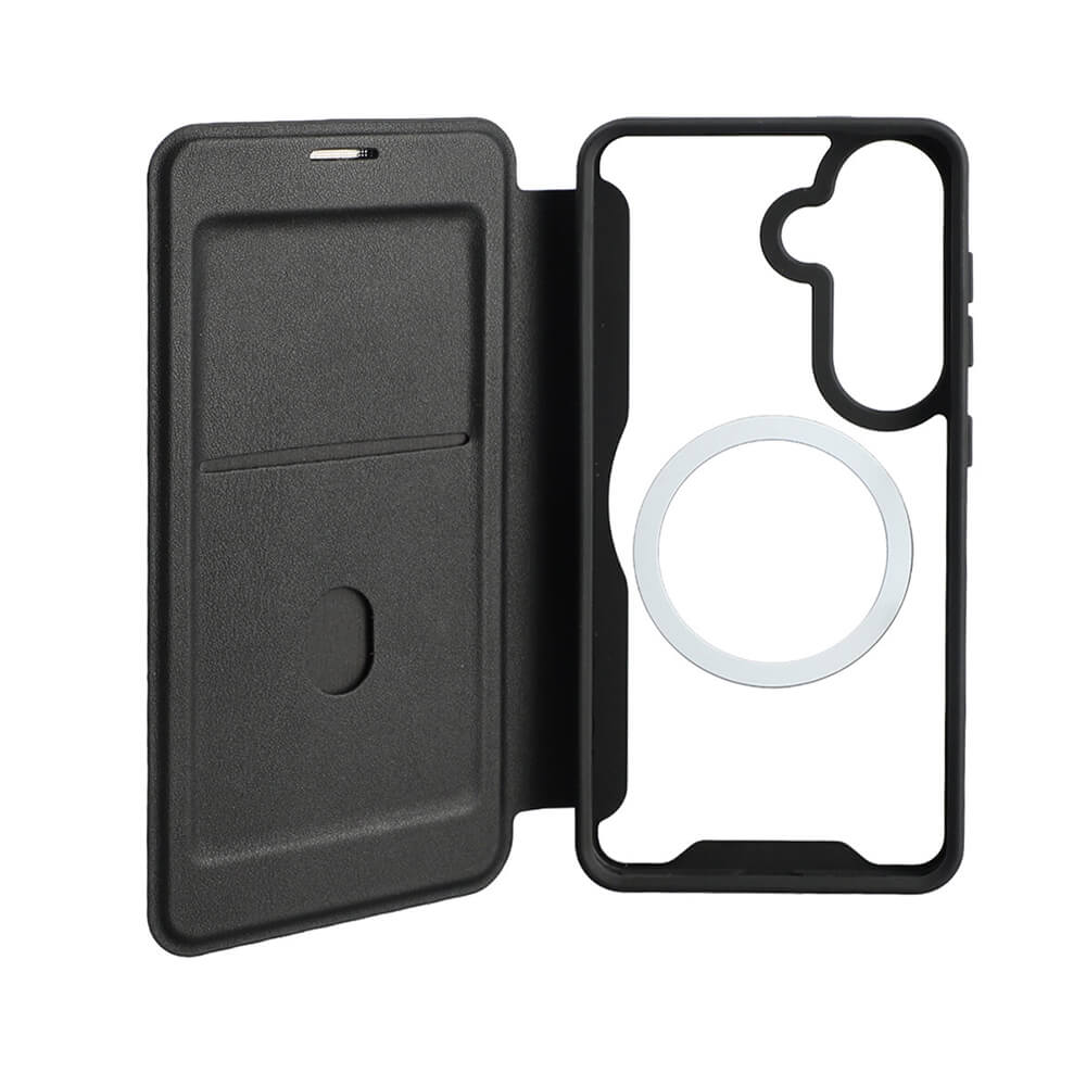 Кожен калъф, тип портфейл с отделение за кр. карти и Qi2 поддръжка за Samsung Galaxy S26 - 4smarts Urban Pro Flipcase (черен)