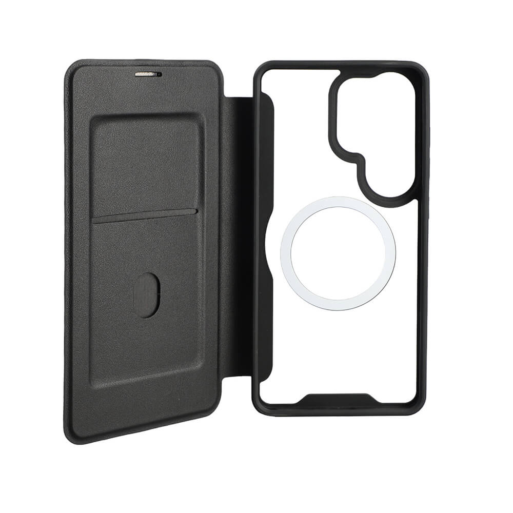 Кожен калъф, тип портфейл с отделение за кр. карти и Qi2 поддръжка за Samsung Galaxy S26 Ultra - 4smarts Urban Pro Flipcase (черен)