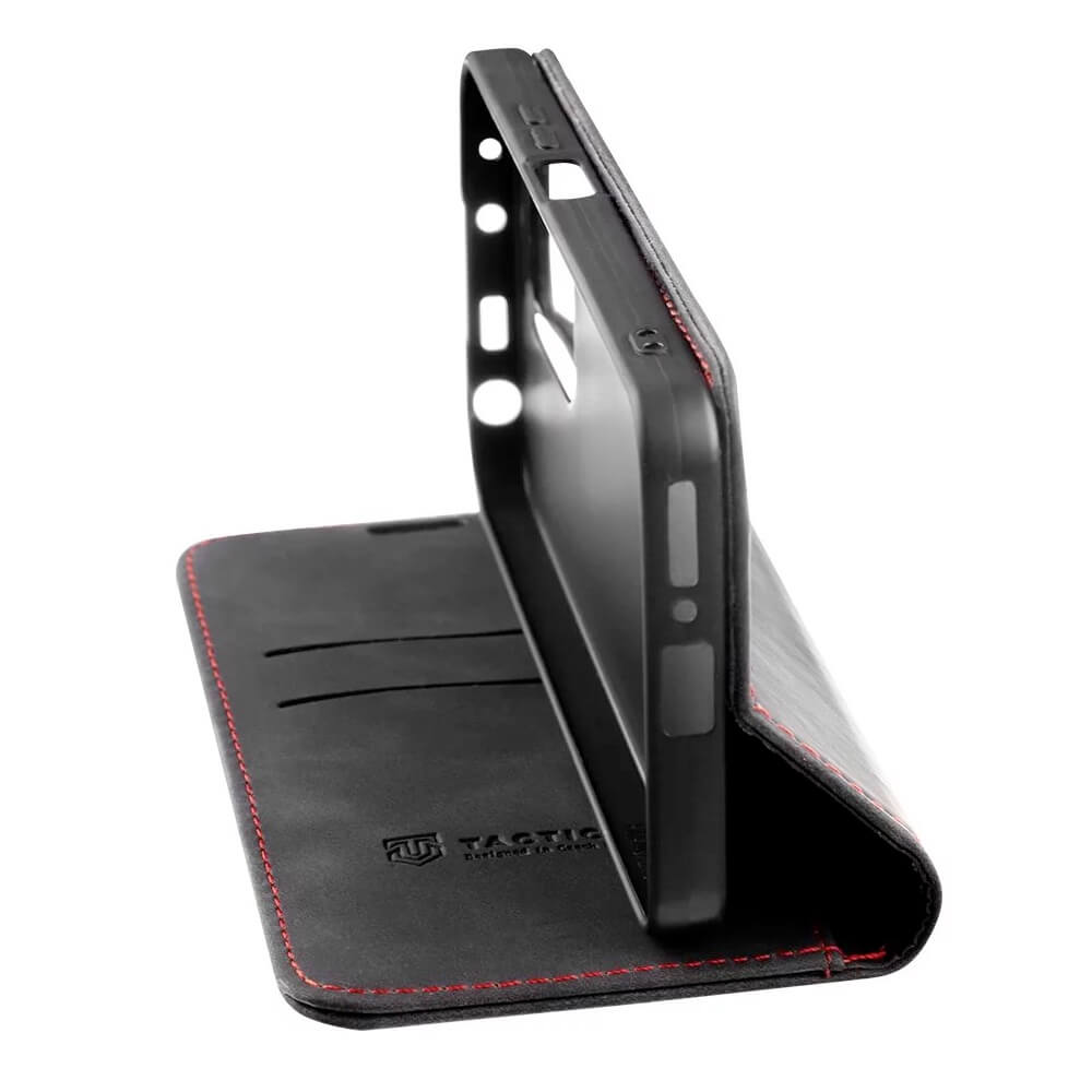 Кожен калъф, тип портфейл с поставка и отделение за кр. карти за iPhone 16 Pro - Tactical Xproof Flip Case (черен)