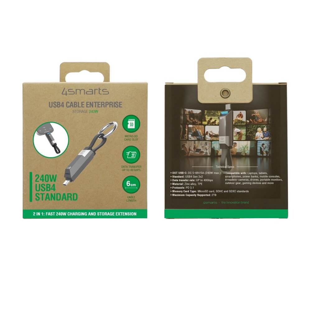Компактен USB-C към USB-C кабел с четец за microSD карти памет за мобилни устройства - 4smarts Enterprise Storage USB4 USB-C to USB-C Cable 240W Card Reading Cable (черен) (6 см)