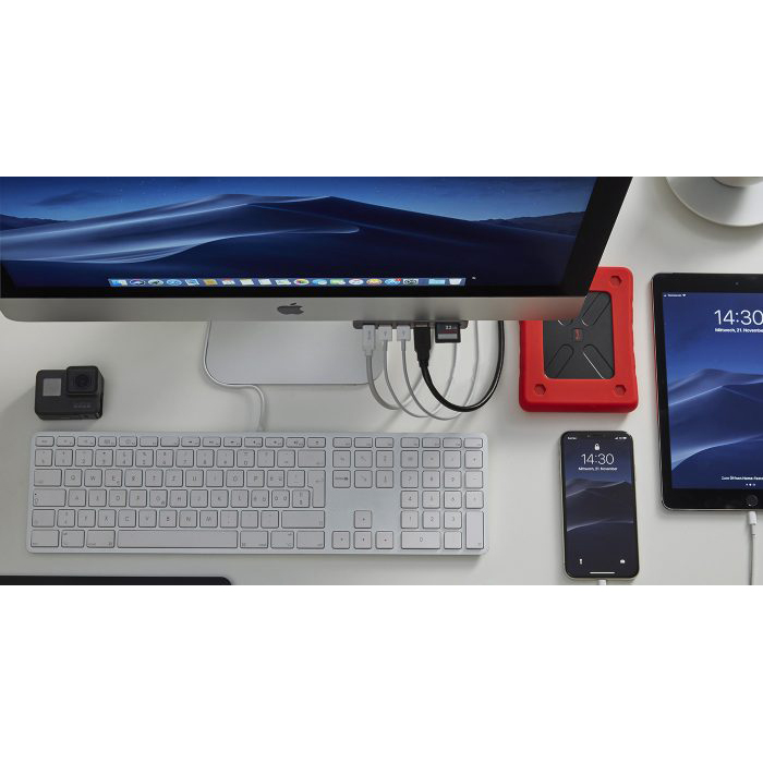 - Алуминиев хъб, предназначен за свързване на допълнителна периферия към вашия iMac с USB-C или Thunderbolt 3