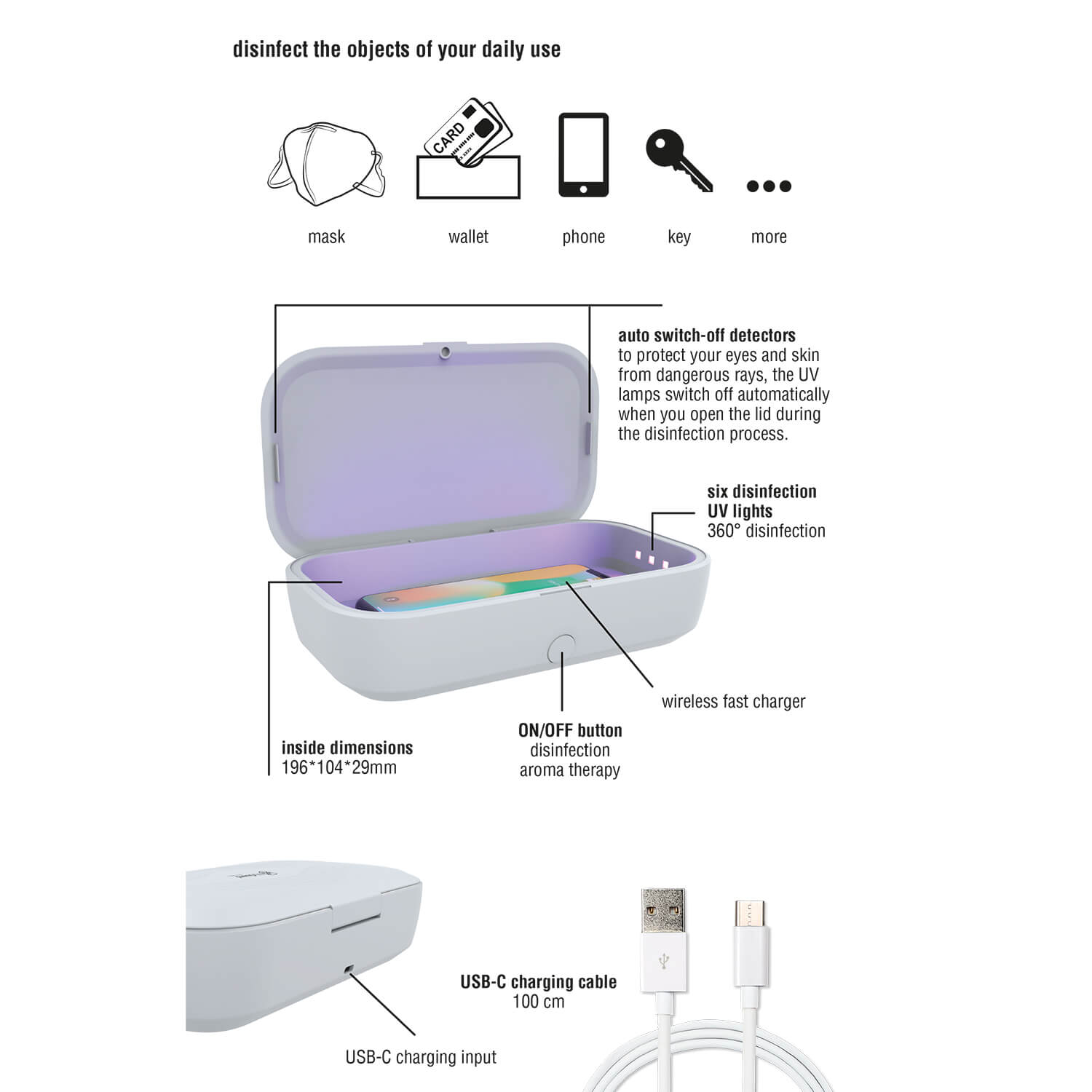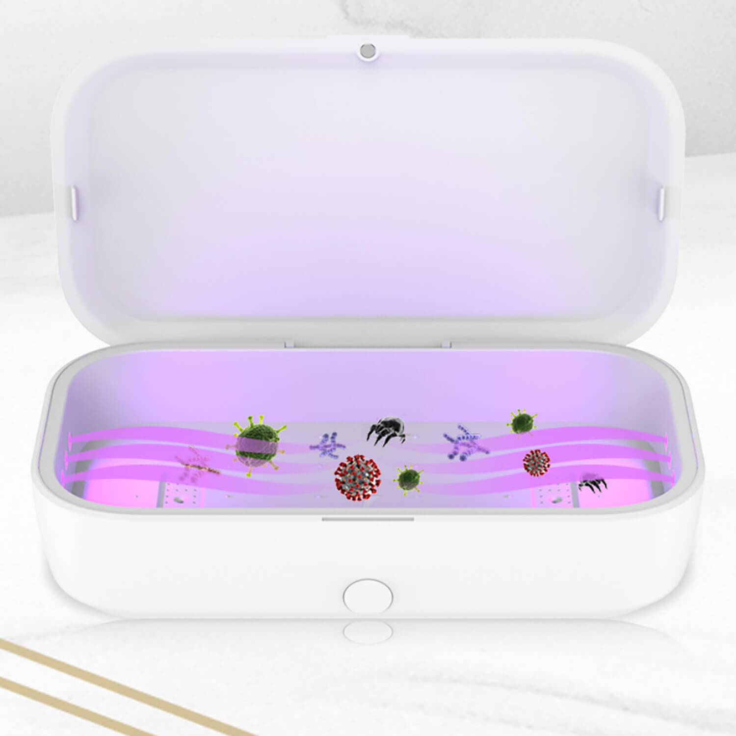 - 360-градусова дезинфекция: Използвайте времето, докато телефонът ви се зарежда да го освободете от 99,9% от всички нежелани бактерии и вредни вируси. Шест ултравиолетови лампи го дезинфекцират от всички страни