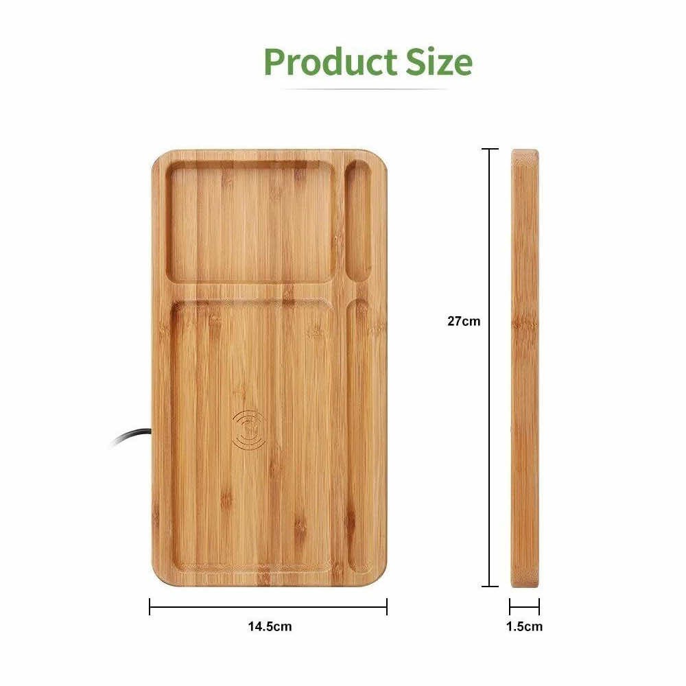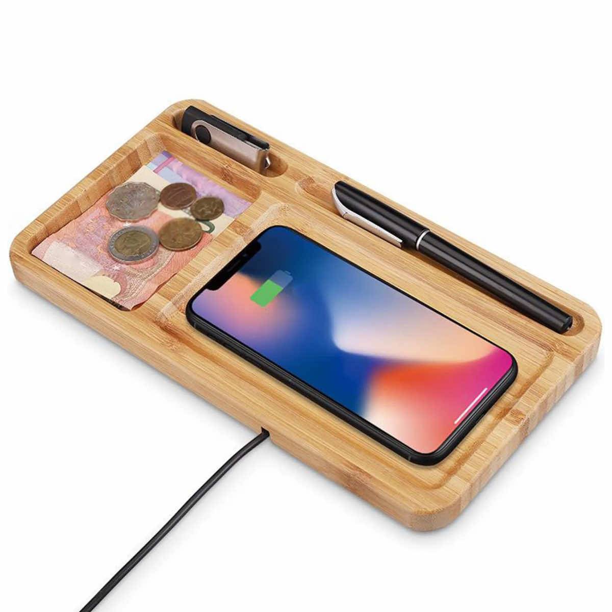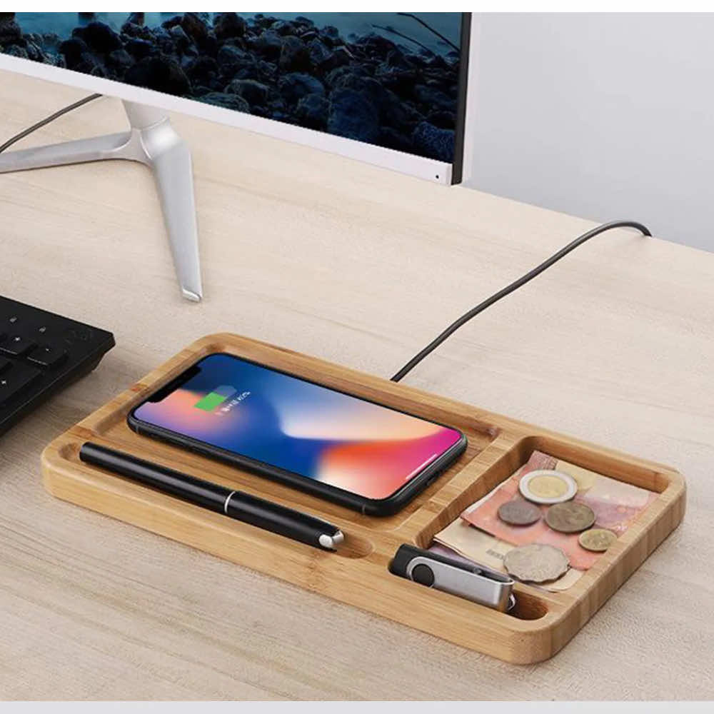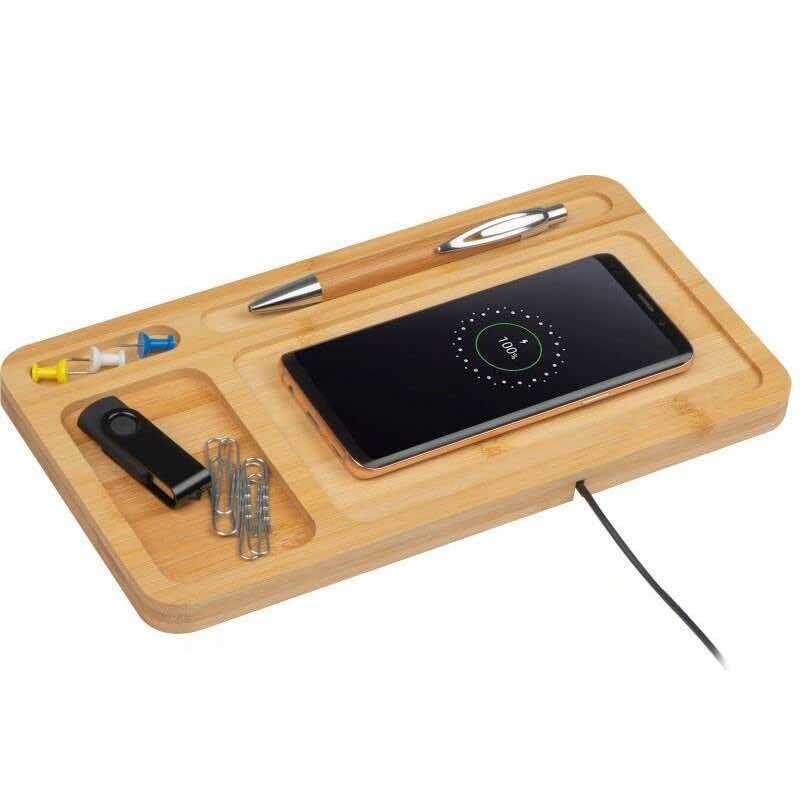 - Луксозен органайзер, изработен от истински бамбук, който ще ви помогне да организирате бюрото си и да зареждате безжично вашето Qi съвместимо устройство