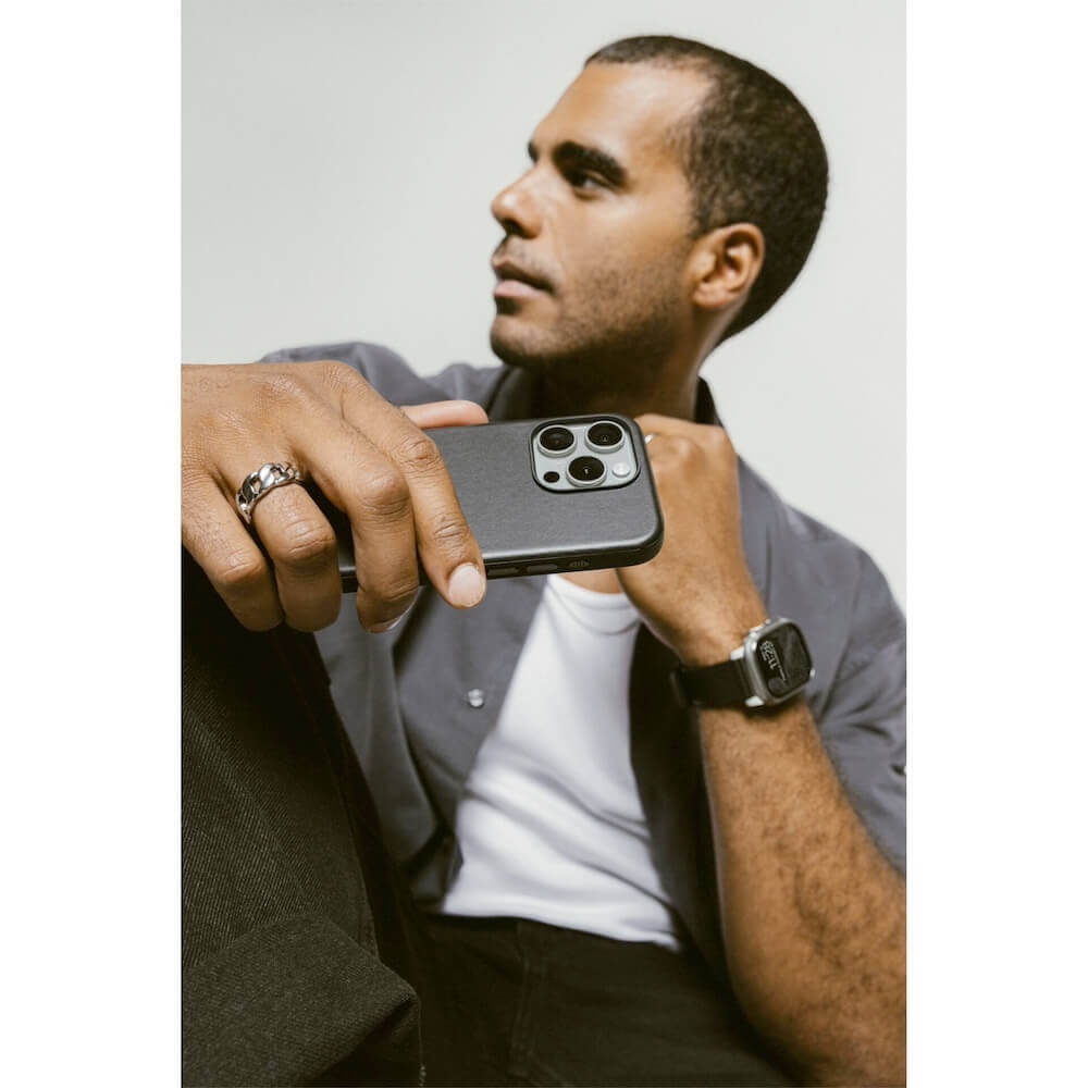 Nomad си сътрудничи с Horween Leather Company, за да предостави най-висококачествена кожа, обработена с естествени материали като смърчова кора и дъб. Калъфът е снабден с анодизирани алуминиеви бутони и отвори за връзка за ръка. Придайте на вашия iPhone 16 Pro уникален стил и защита.
