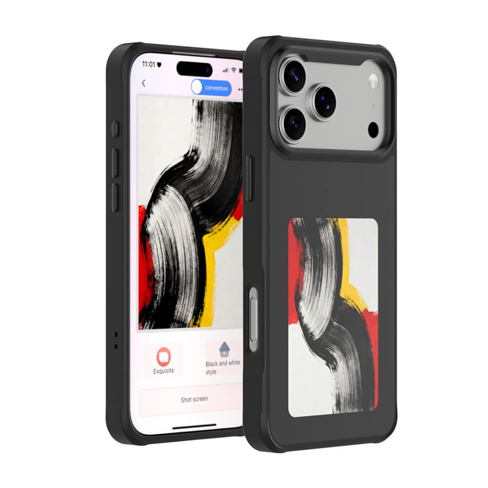 - E-Ink дисплеят показва вашите изображения, текст или дизайни постоянно – без да консумира енергия. След като бъде актуализирано, съдържанието остава видимо без батерия или връзка. За разлика от конвенционалните дисплеи, E-Ink не изисква постоянно захранване. Вашето изображение остава стабилно и непроменено, независимо дали вашият iPhone е зареден или не. Това превръща вашия калъф в постоянен дисплей за лично съдържание.