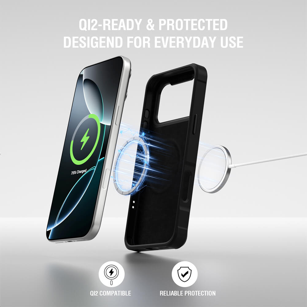 - Кейсът е съвместим с Qi2 и обичайните MagSafe аксесоари, като зарядни устройства и поставки. Магнитното подреждане осигурява сигурно захващане и удобно поставяне по време на зареждане – без допълнителни аксесоари или повторно свързване. В същото време предлага надеждна ежедневна защита за вашия iPhone. Прецизното прилягане предпазва устройството от драскотини и удари, без да ограничава работата с него. Бутоните, портовете и зоната на камерата остават свободно достъпни.