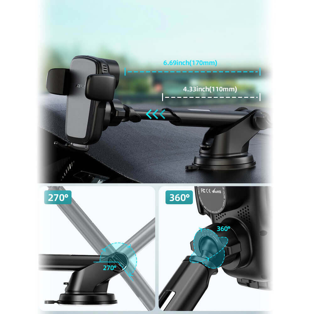 - Закрепя сигурно вашия смартфон към таблото на автомобила ви, за по-удобно и оптимално ниво на гледане. Това предотвратява разсейването по време на шофиране.