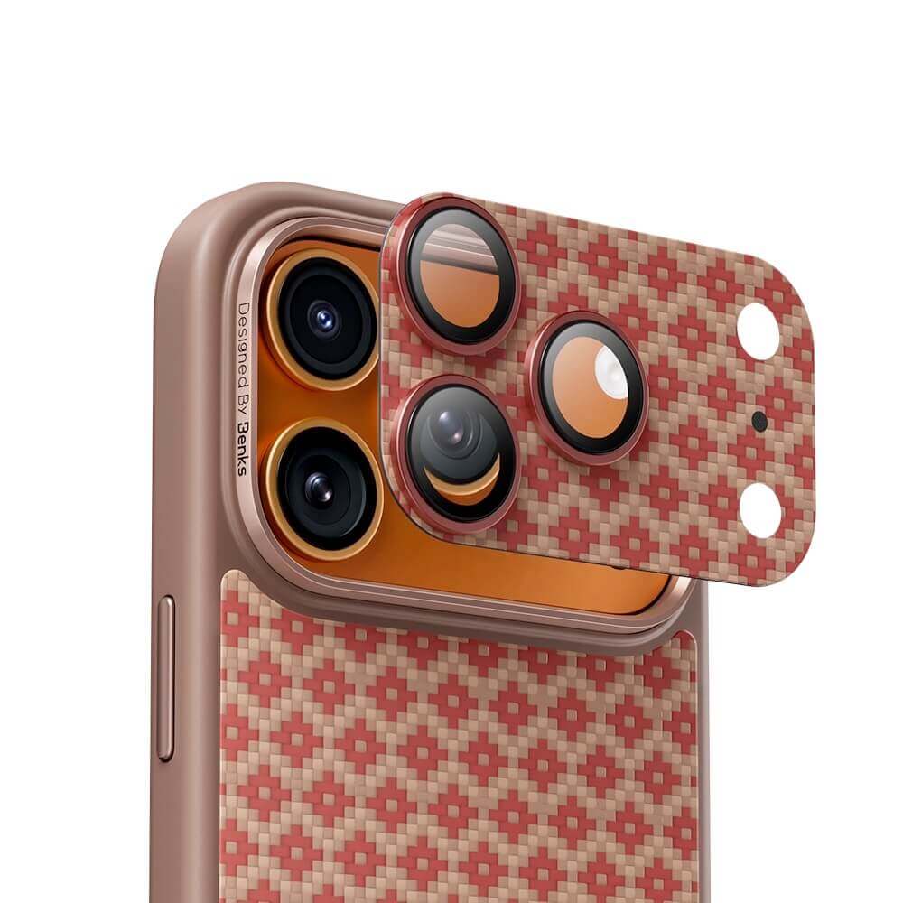 Предпазни стъклени лещи с цяла кевларна плочка за камерата на iPhone 17 Pro Max - Benks ArmorWarrior Aramid Lens Protector Tempered Glass (оранжев)
