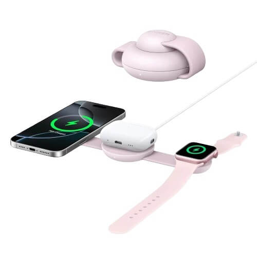Преносима тройна поставка (пад) за безжично зареждане за iPhone с MagSafe, Apple Watch, AirPods и Qi съвместими мобилни устройства - Anker MagGo 3-in-1 MagSafe Qi2 Foldable Pad (розов)