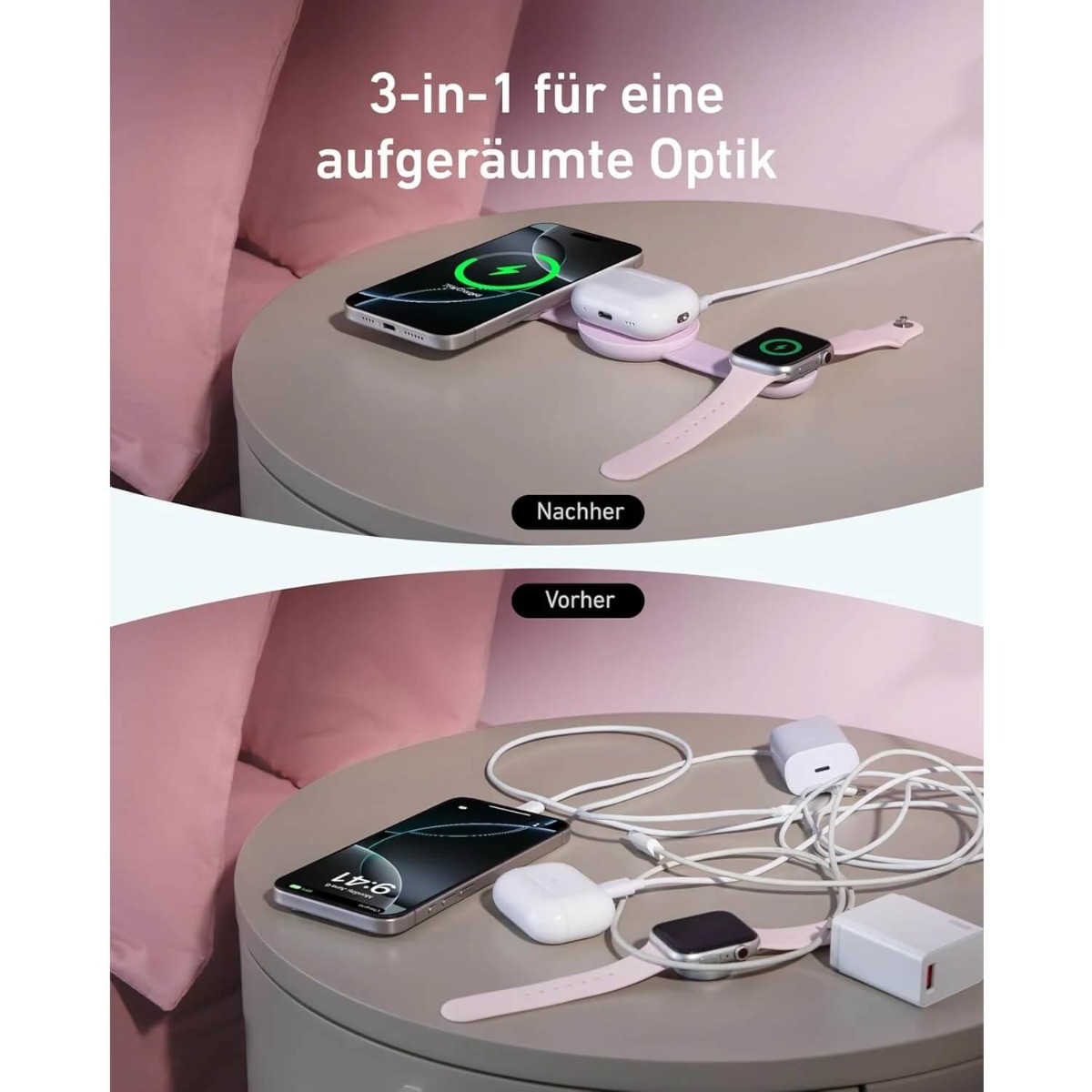 С Anker MagGo можете да зареждате едновременно вашия iPhone с MagSafe, Apple Watch и AirPods. Удобният тройна поставка осигурява бързо и надеждно зареждане, което е особено полезно за активни потребители.