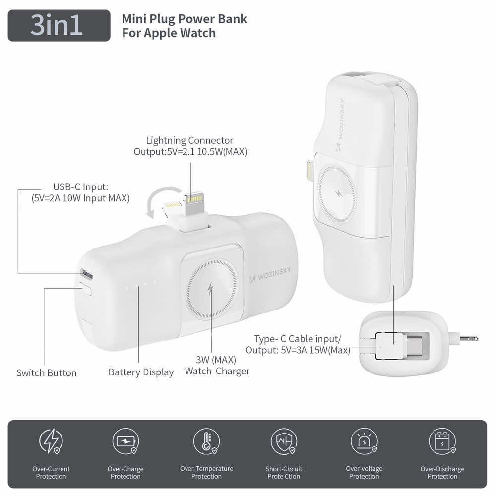 Представяме ви Wozinsky 3-in-1 Lightning Power Bank с Apple Watch зарядно, идеално решение за зареждане на вашите устройства в движение. С капацитет от 5000mAh, тази батерия е перфектна за всеки, който търси надеждност и удобство.