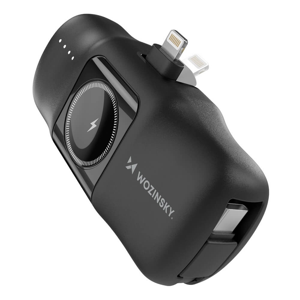 Преносима външна батерия с вграден Lightning конектор, USB-C кабел, USB-C порт и зареждане на Apple Watch - Wozinsky 3-in-1 Lightning Power Bank With Apple Watch Charger 5000mAh 15W (черен)